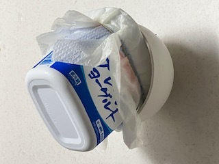 ・ヨーグルトの水切りをする。ヨーグルトのパックにキッチンペーパーで蓋をし輪ゴムで止める。器にヨーグルトをパックごと逆さまに傾けて置き、冷蔵庫で4~5時間水切りする。1p(450g)のヨーグルトが200g以下になればよい。