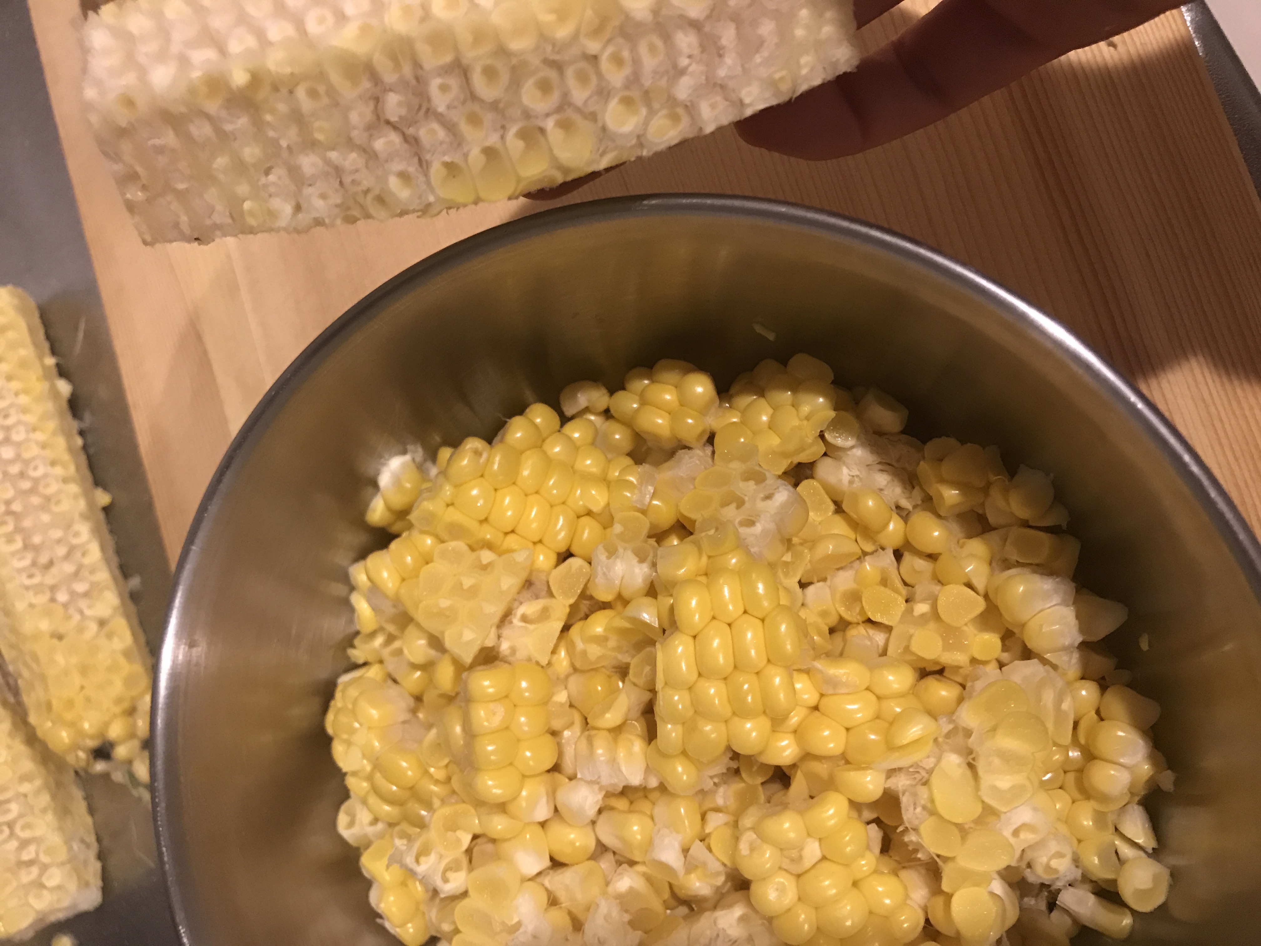 とうもろこしは長さを半分に切って切り口を下にして置き、包丁で実をそぐ。玉ねぎはくし切り、じゃがいもは皮を剥き適当な大きさに切る。