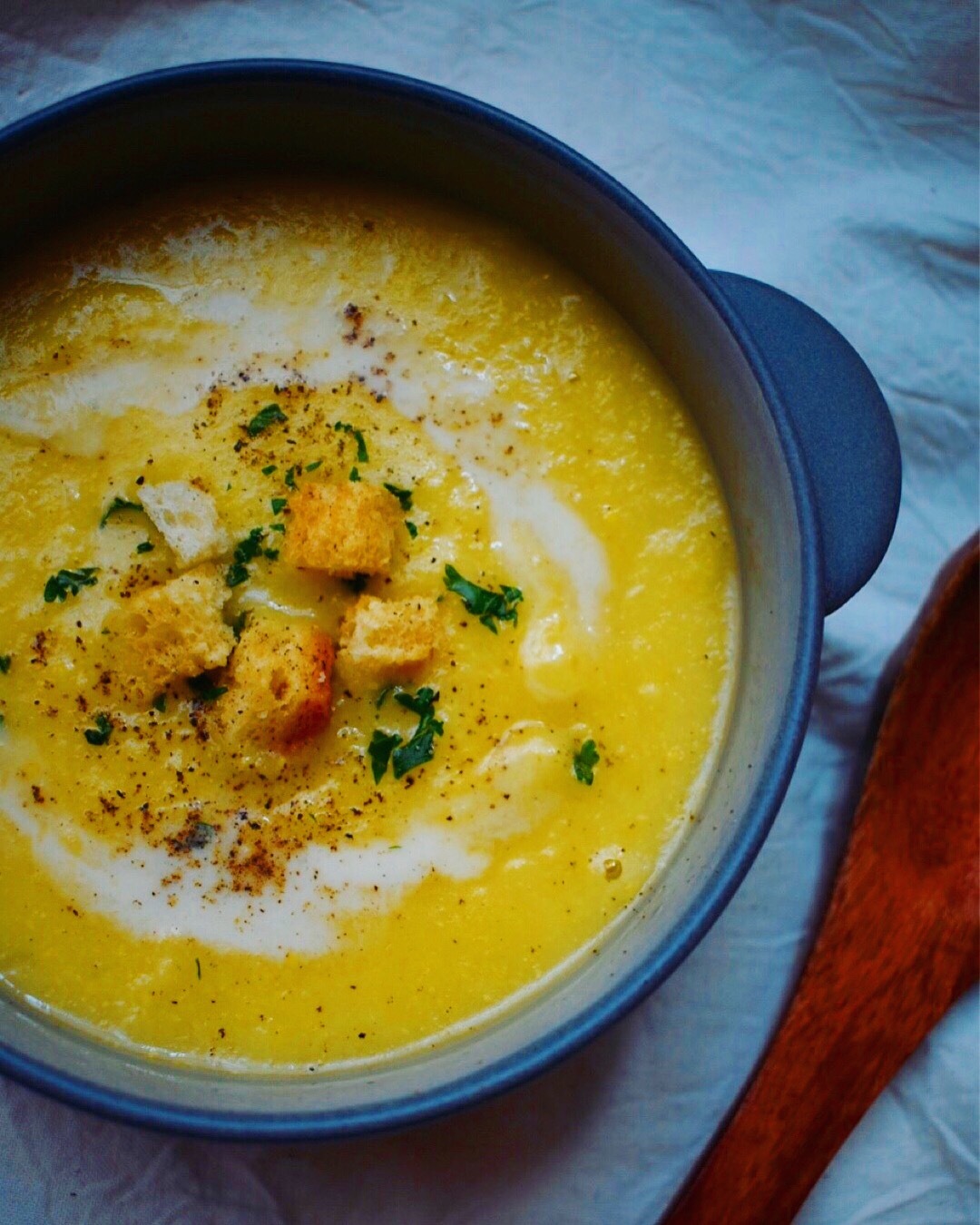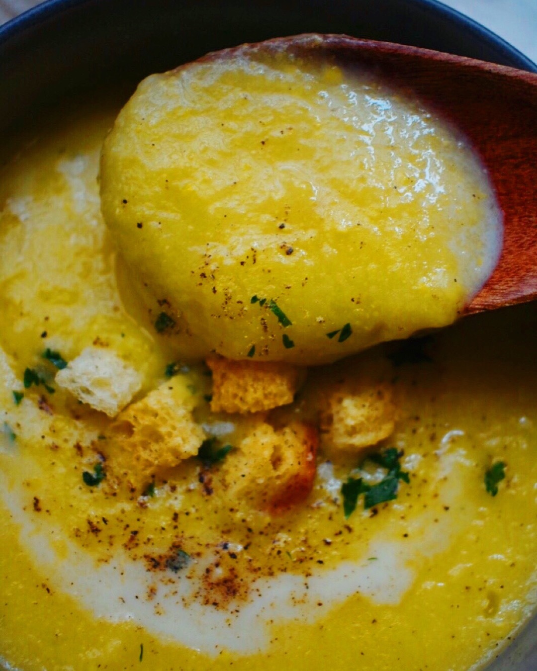 - 再加熱し、一煮立ちしたら塩で味を調える。器によそい、お好みで生クリーム、や黒胡椒、刻みパセリ、クルトンなどを。