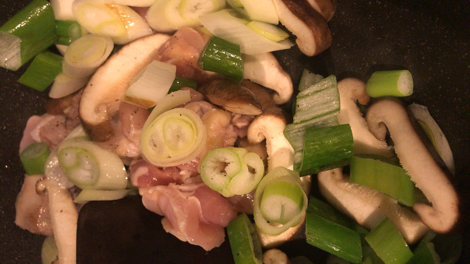 フライパンに油(分量外)を薄くひき、鶏肉と長ネギ、しいたけを入れ中火にかける。