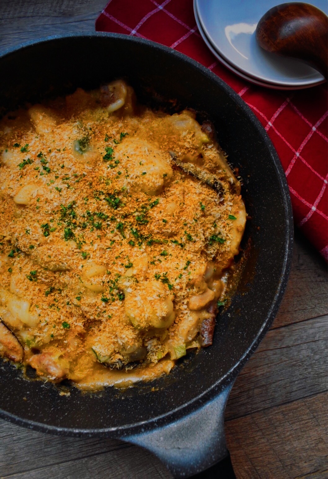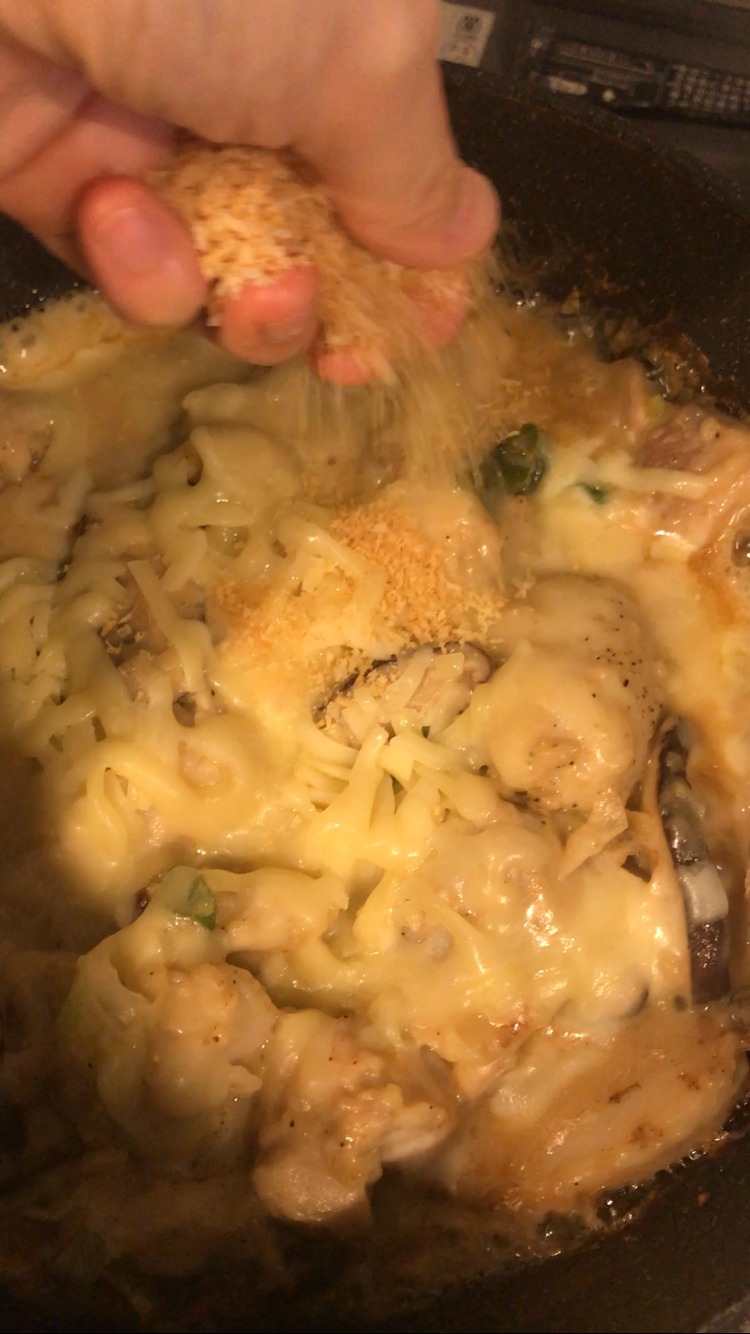 とろみがついたら、ピザ用チーズを乗せる。チーズが溶けたら、乾煎りしたパン粉をまぶし、刻みパセリを散らす。