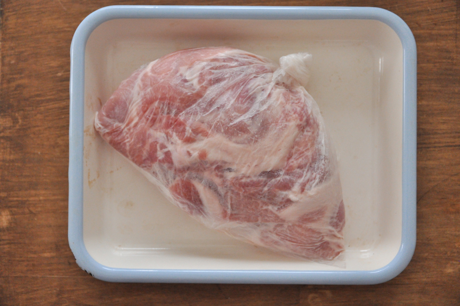 ビニル袋に、ヨーグルト、塩を入れて混ぜた後、豚肉を入れ全体をなじませる。冷蔵庫で3日間保存可能。(保存時間は調理時間に含みません)