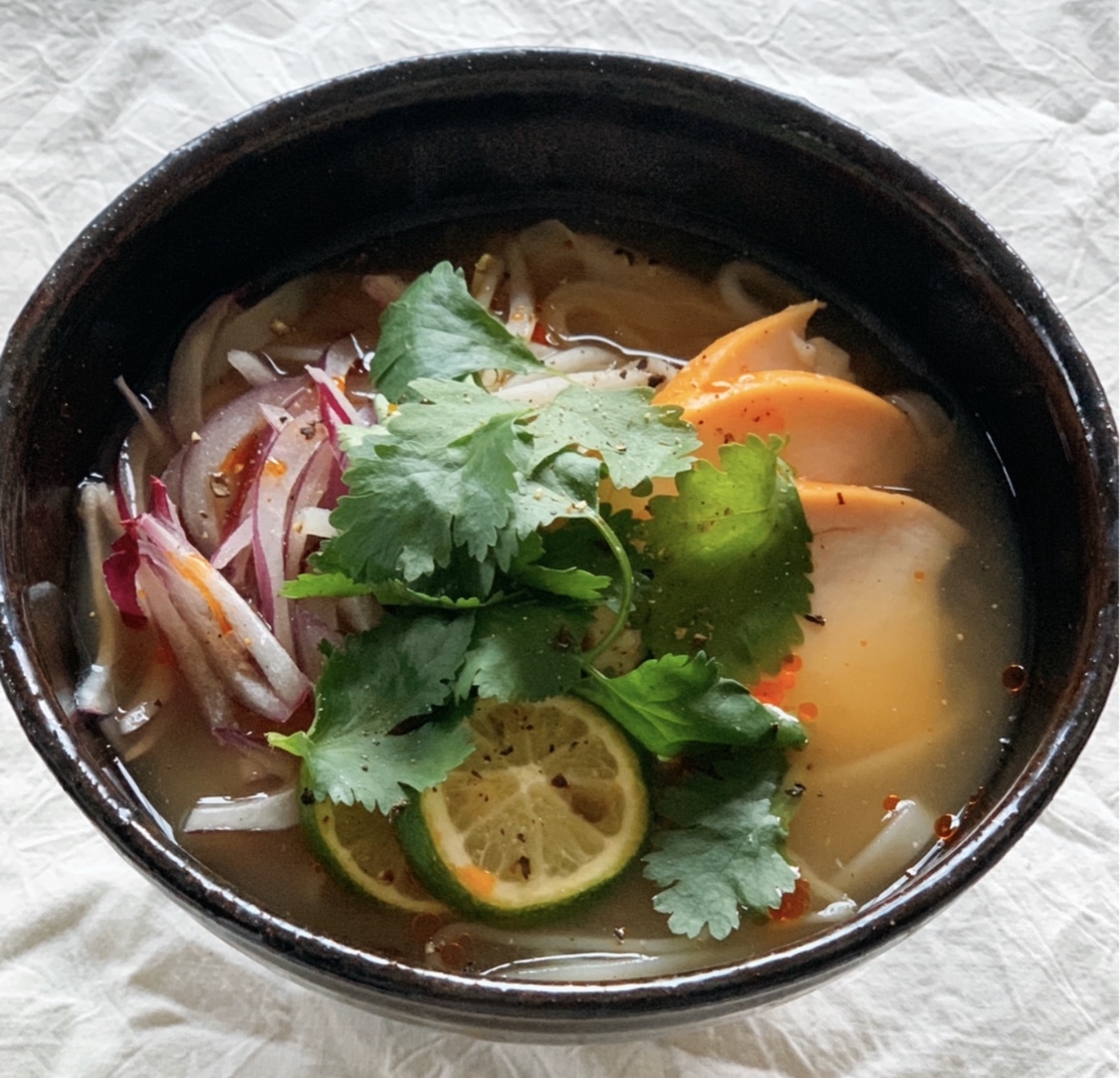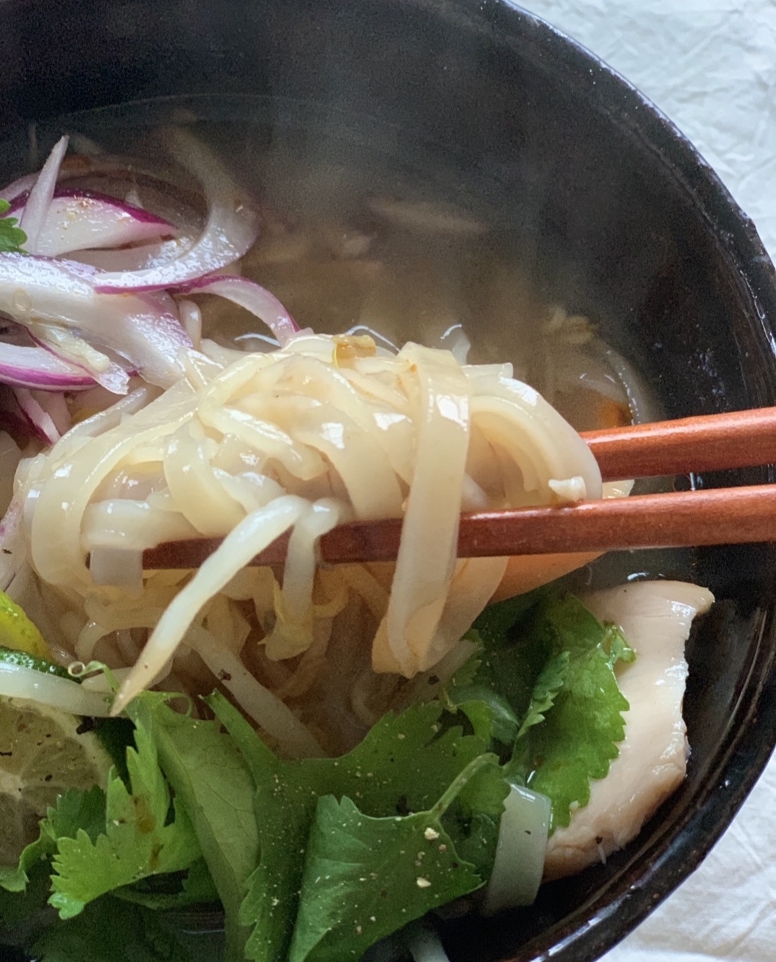 ベトナムの麺料理の定番である「フォー」。お米とタピオカでん粉を原料としたグルテンフリーの麺です。私のお気に入りはトッピングのお野菜をたっぷり盛り付けて、生姜を少し多めに入れて食べること。これからの季節にぴったりです。