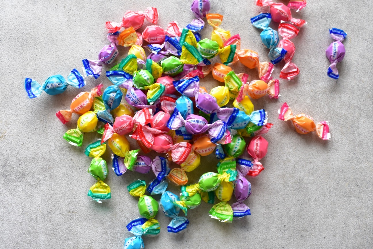 新宿高野のフルーツチョコレートを使ったスタイリングです。カラフルでコロコロ可愛らしいチョコレートです。