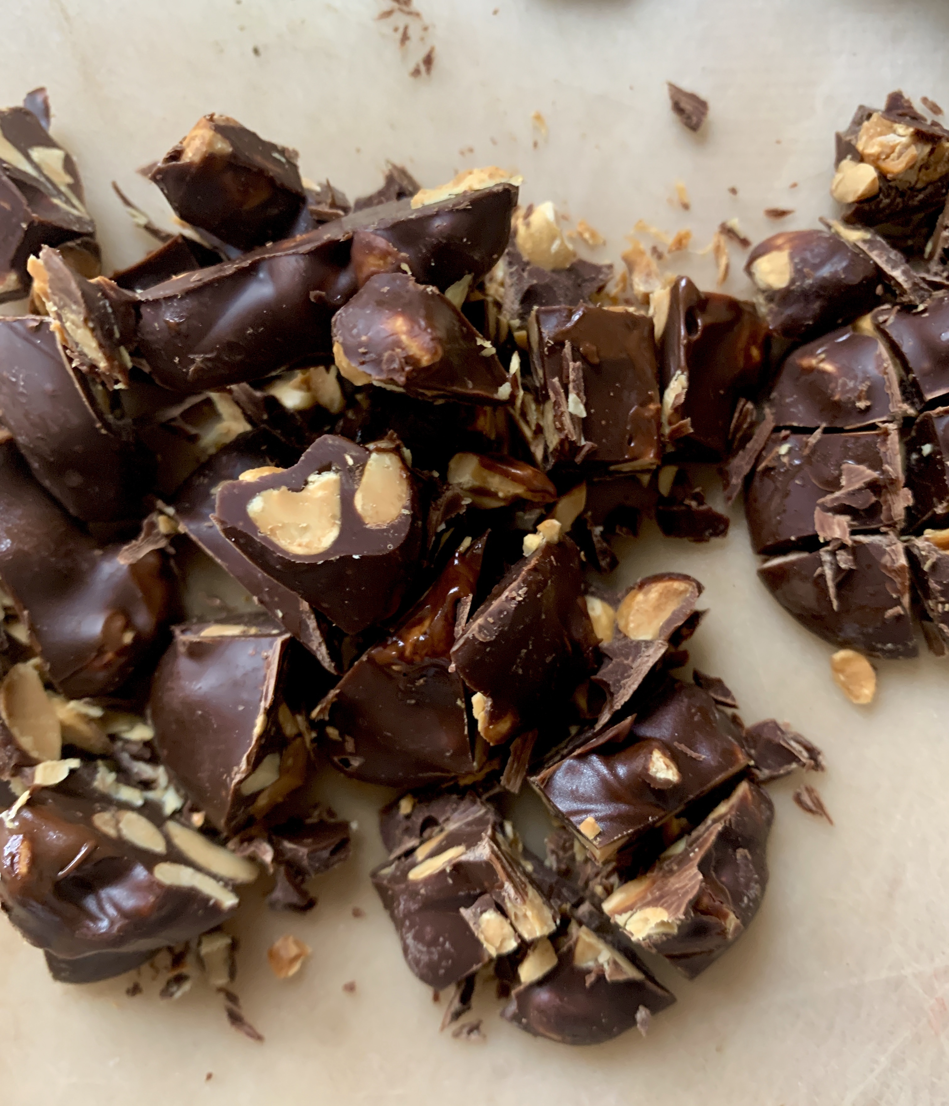 《下準備》 チョコレートは細かく刻み、湯煎する。今回はピーナッツ入りのブロックチョコレートを使用。