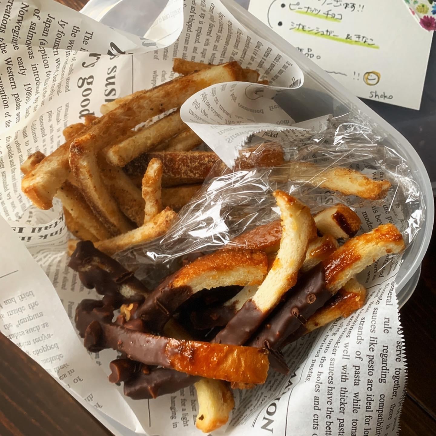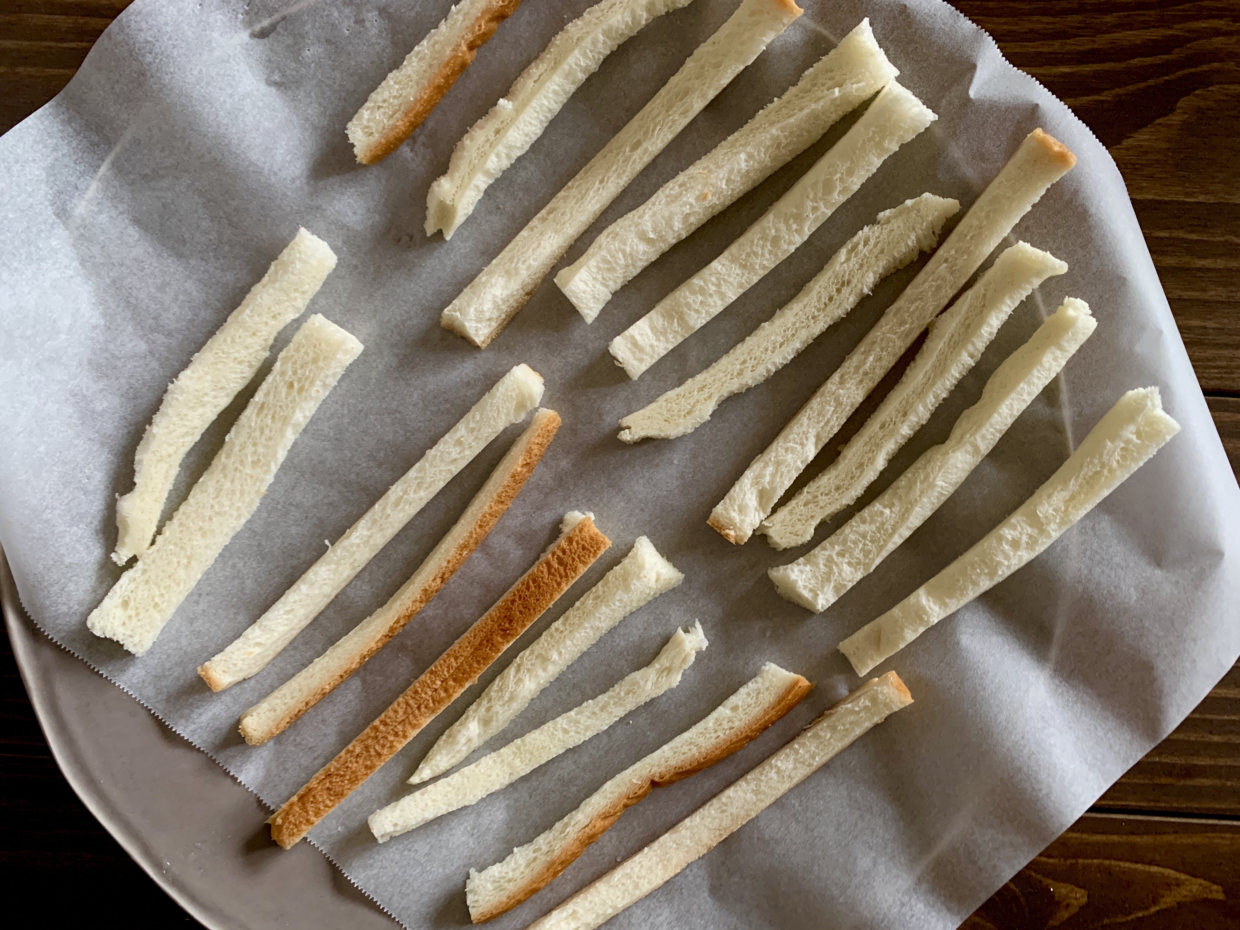食パンを細切りにする。耐熱の平皿にクッキングシートをひき、食パンが重ならないように並べる。ラップをせずに電子レンジ(600w2分)で加熱し、全体を軽く混ぜて再度電子レンジ(600w2分)へ。