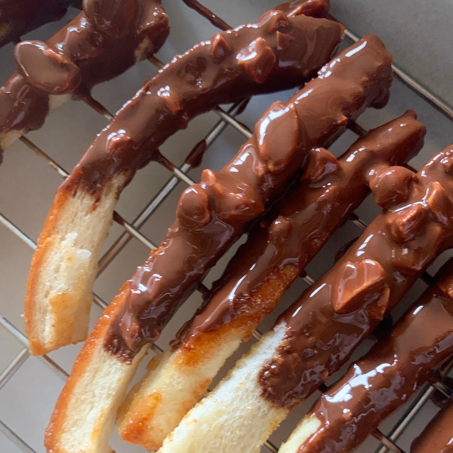 グラニュー糖が固まり、食パンがカリカリになったら取り出して湯煎したチョコレートをかけ、冷蔵庫で冷やす。