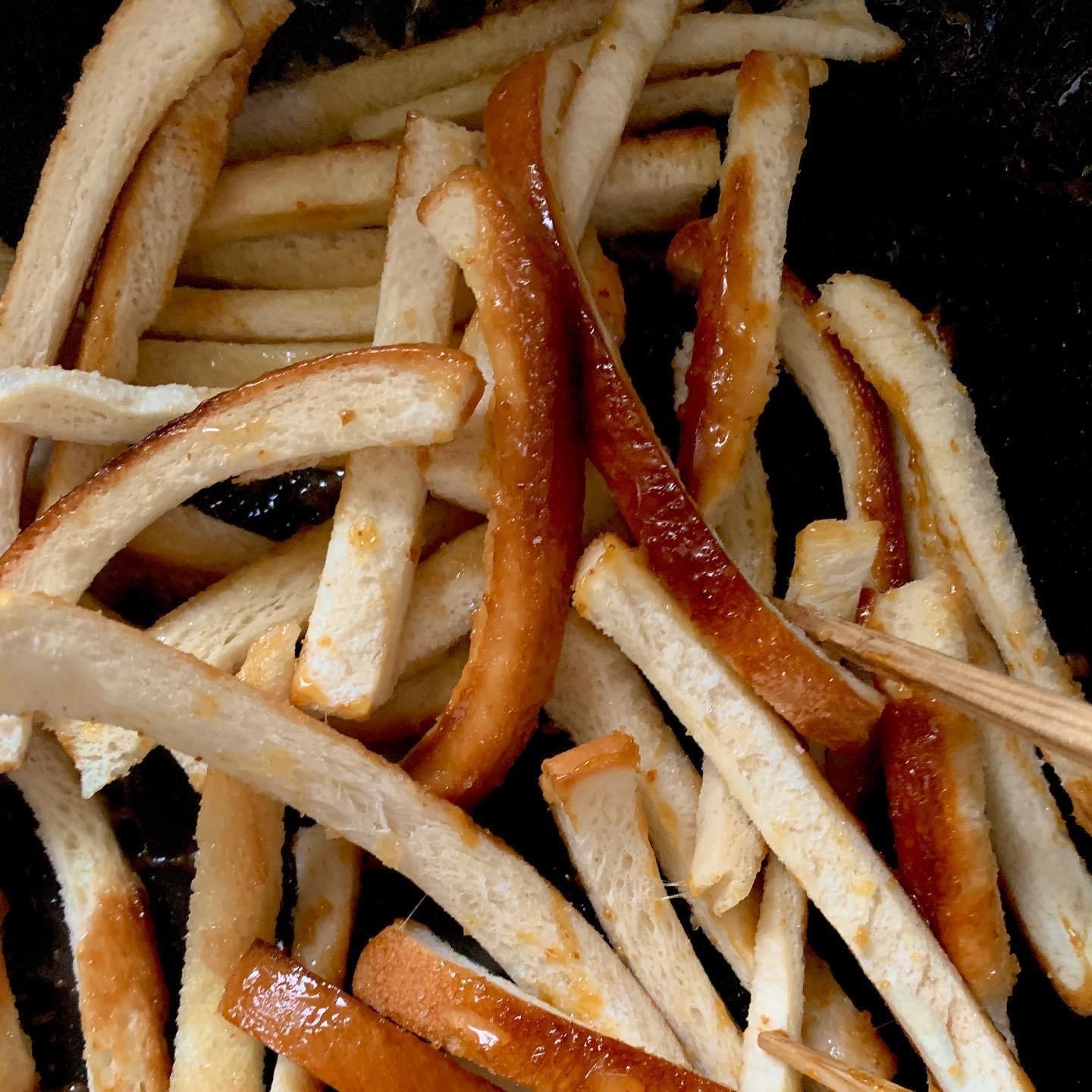 フライパンにバター、グラニュー糖、①の食パンを入れ、弱火にかける。バターとグラニュー糖が溶けてくるので、適度に揺すりながら食パンを絡める。