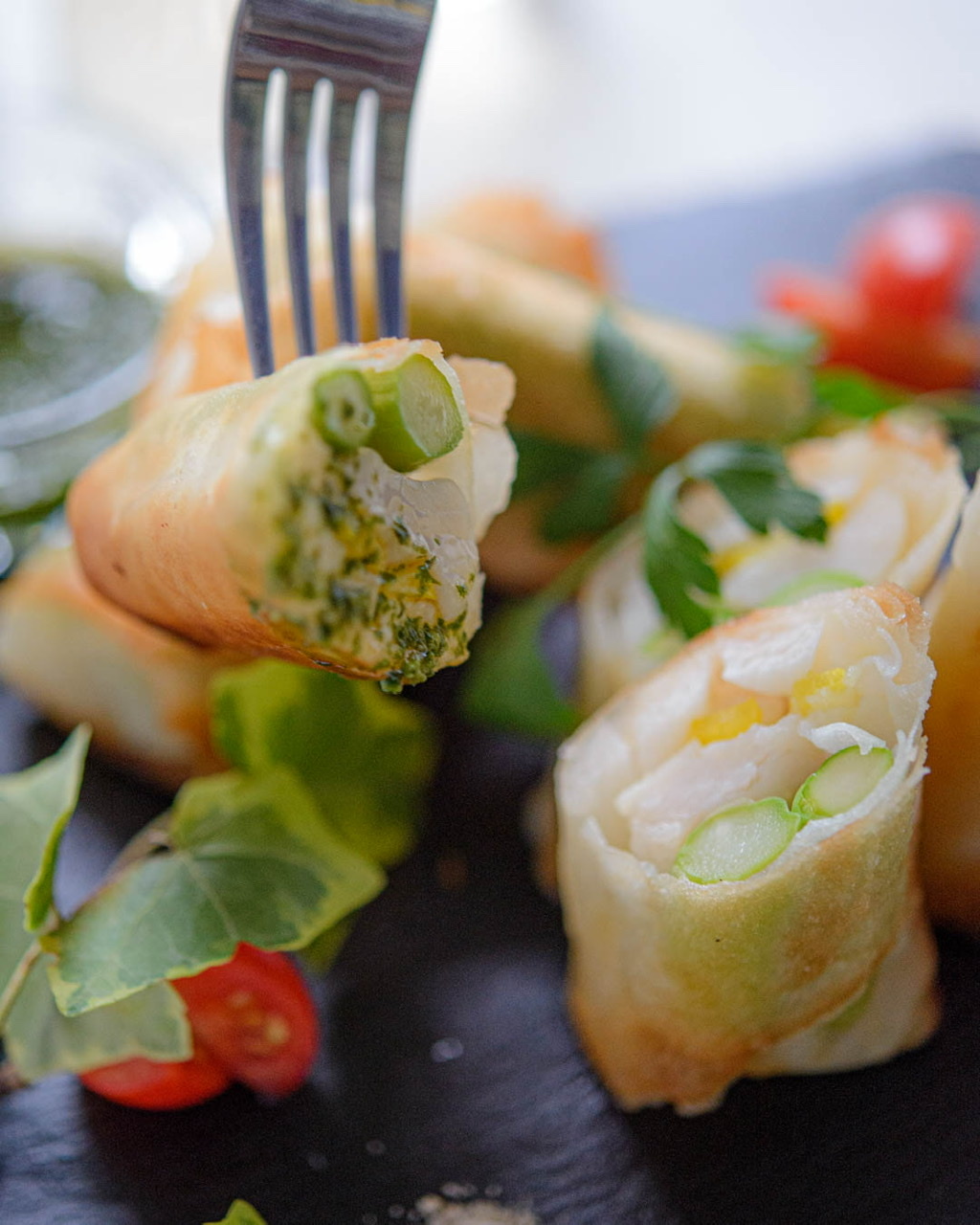 ・春巻きは半分に切って盛り付けると断面が綺麗に見えます。