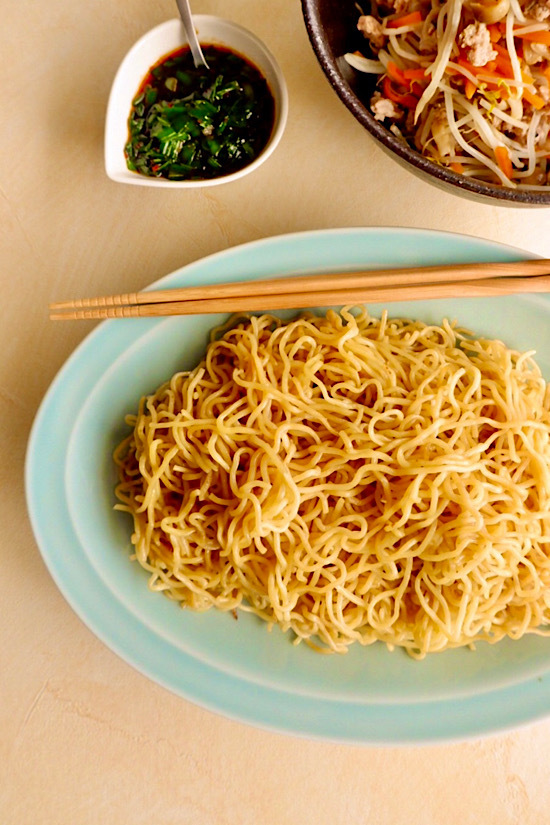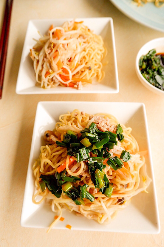 - フライパンの汚れをふき、米油大さじ1を熱し焼きそばを入れ全体に油が回ったら、合わせ調味料を回し入れサッと絡め器に盛る。