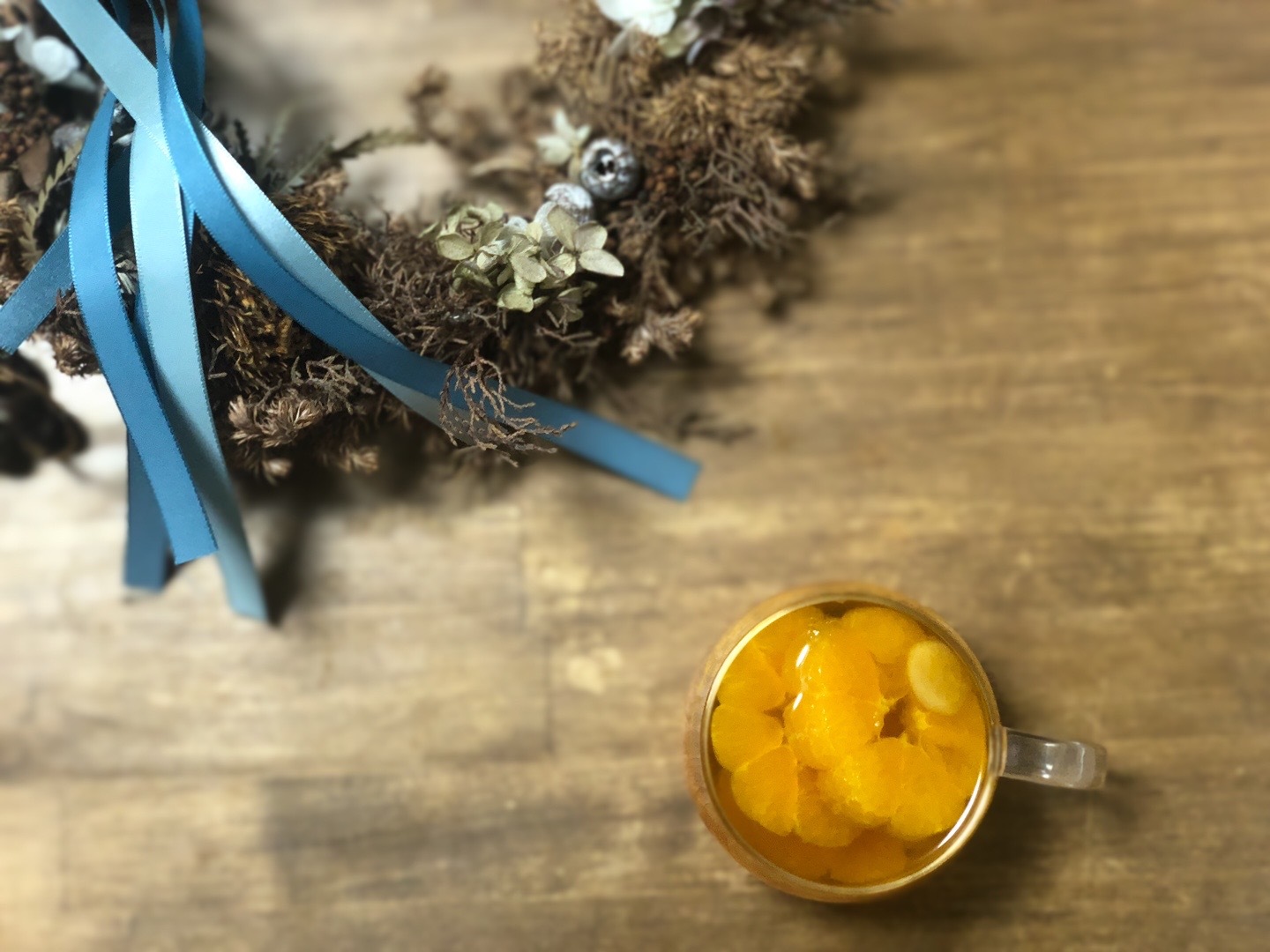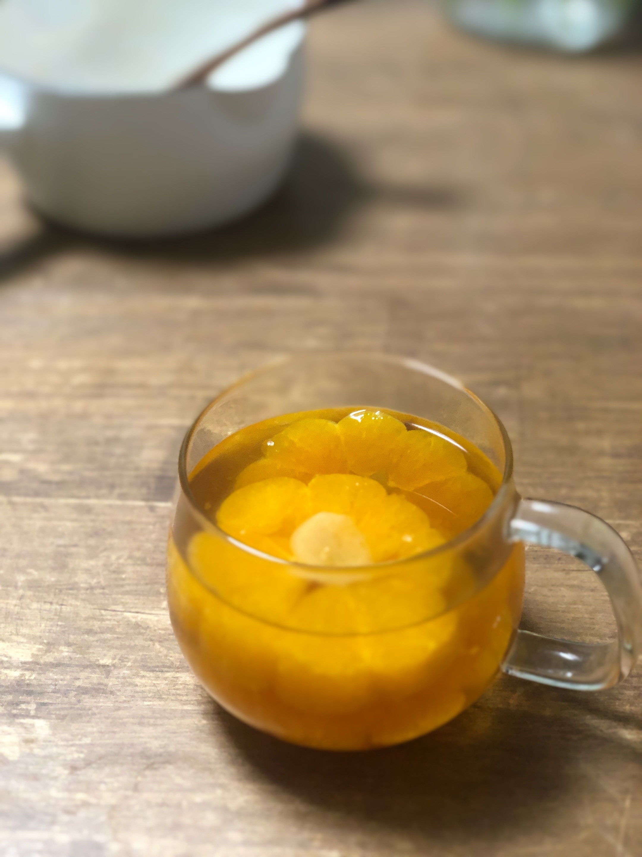 - 鍋にワイン、しょうが、砂糖を入れ、フツフツと湧いていたらみかんを入れ、ひと煮立ちしたら火を止め、カップに入れる。