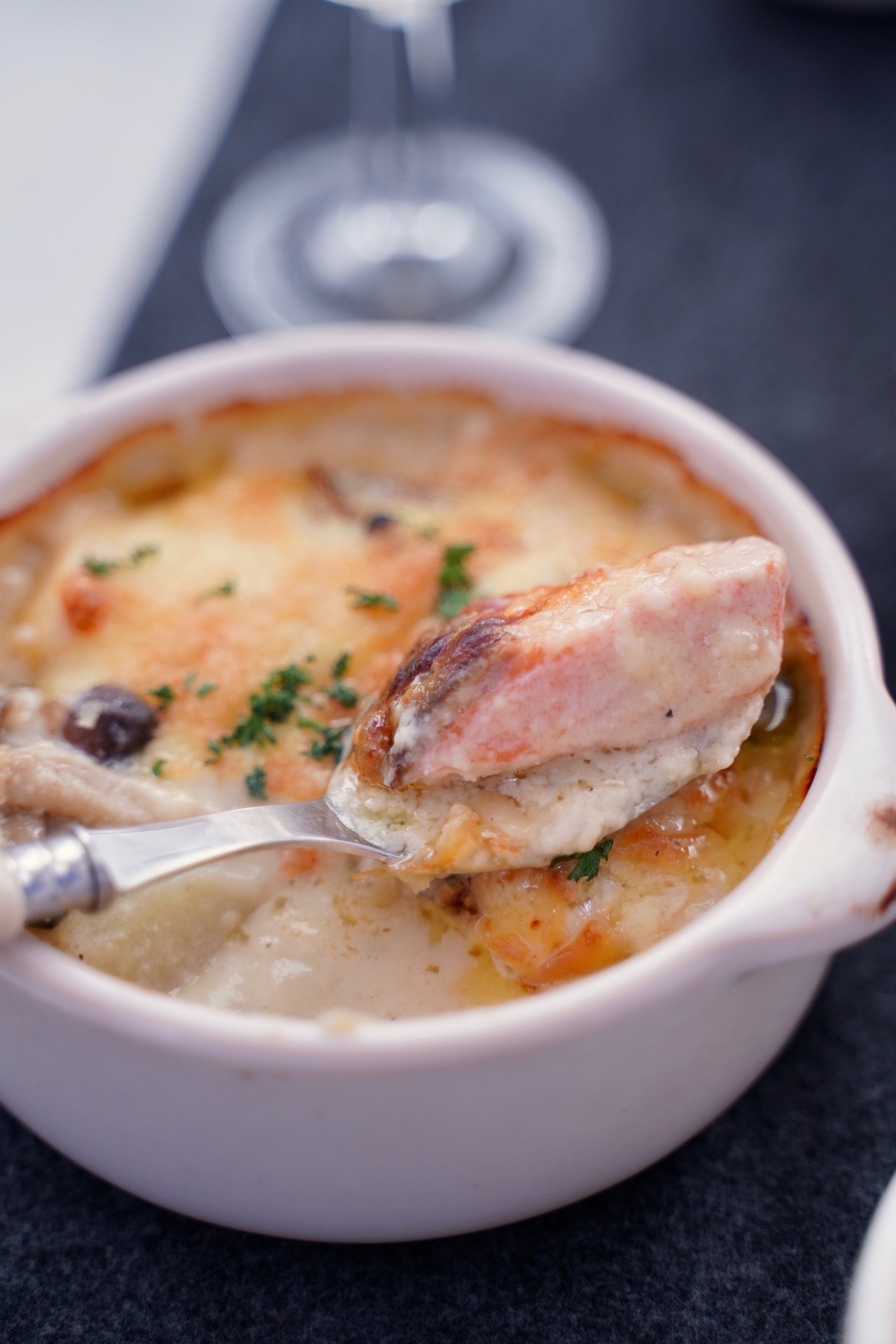 - 鮭に塗っているAを軽く落とし一口大に切り、じゃがいも、しめじをホワイトソースに混ぜ合わせ、耐熱皿に入れ