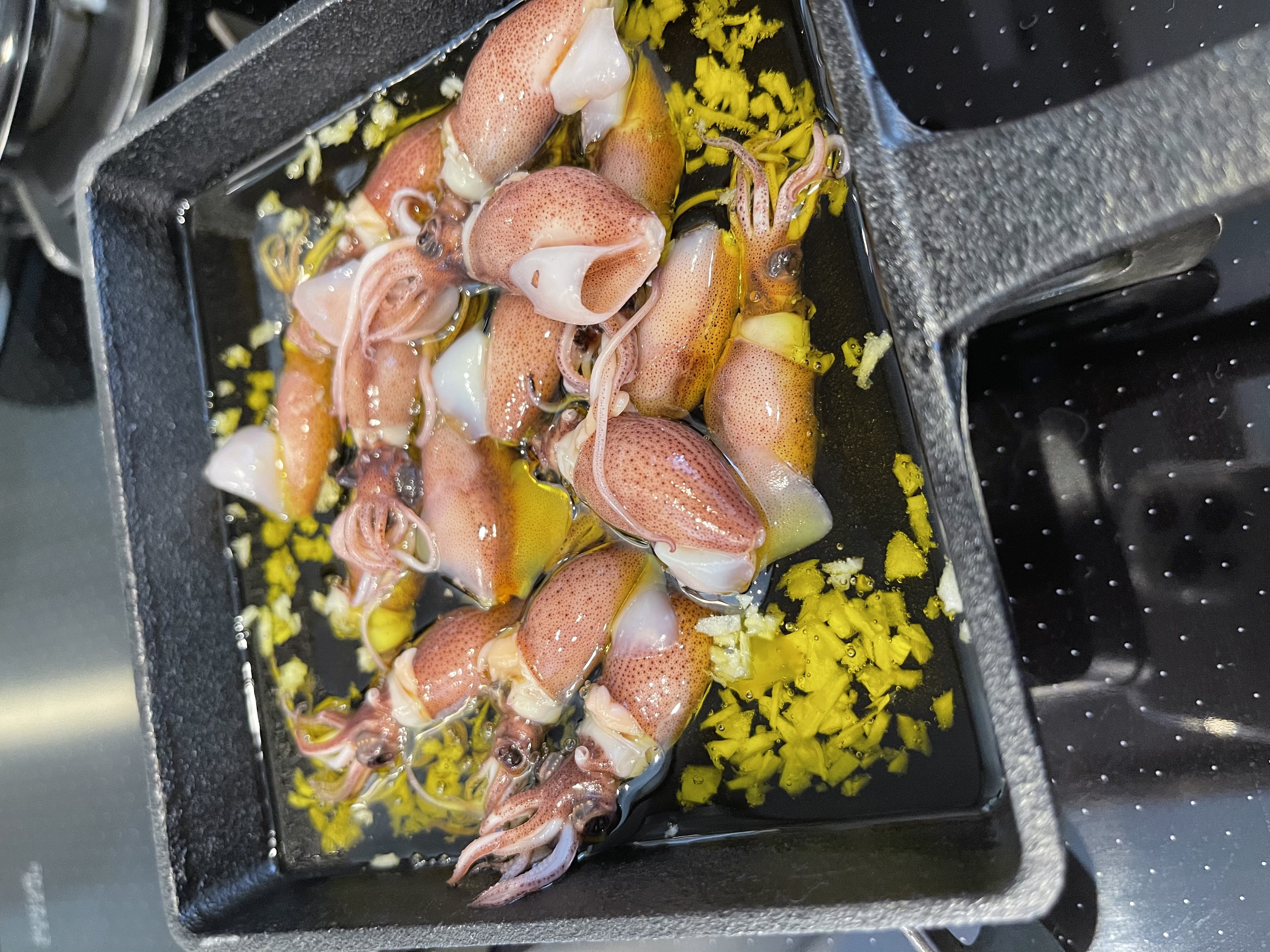 スキレットにニンニク、ホタルイカ、オリーブオイルをひたひたに入れ、弱火にかける。