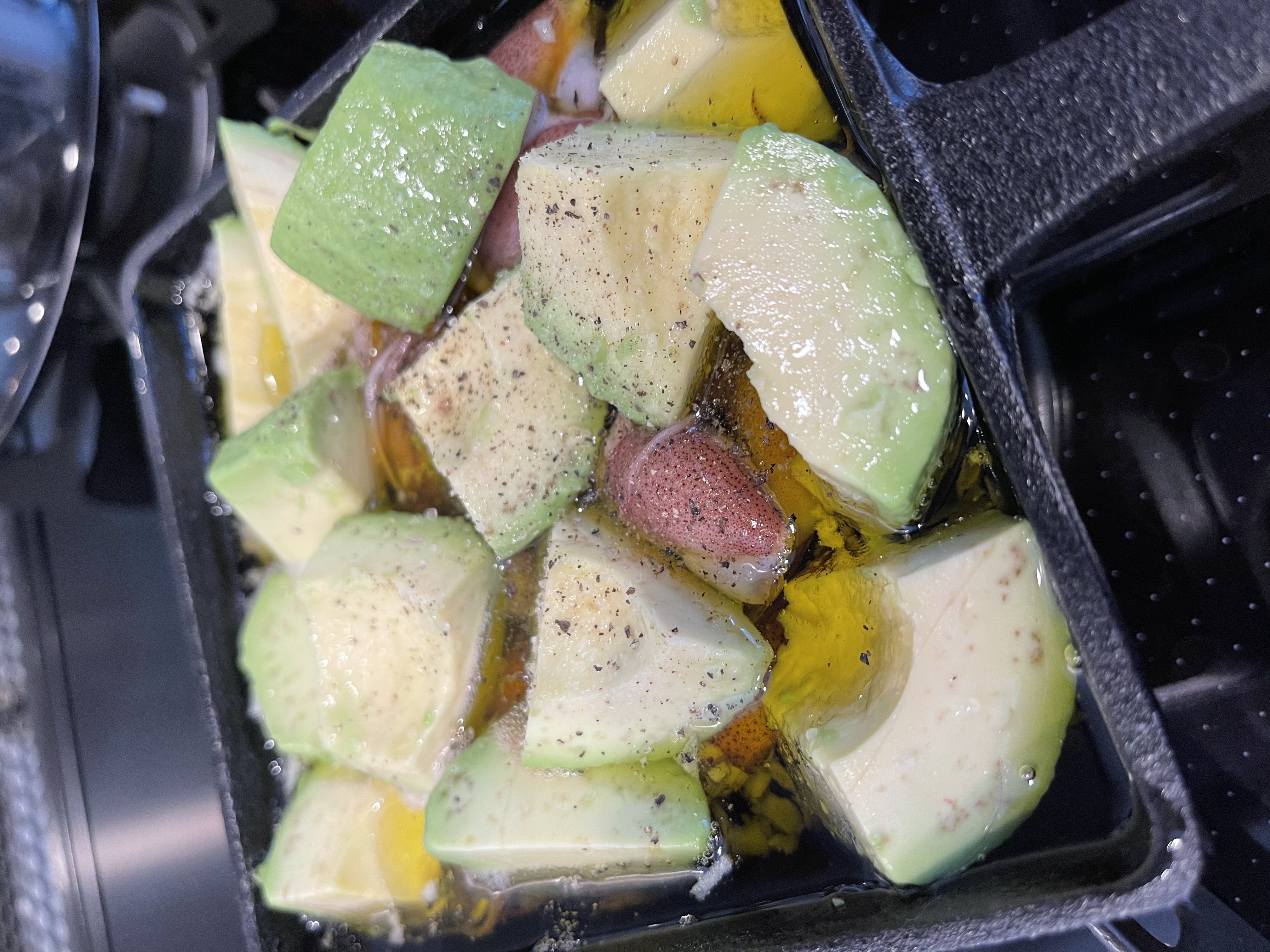 ニンニクの香りが立ってきたらアボカドも入れ、塩、胡椒も入れる。この時にオイルをひたひたになるように足す。