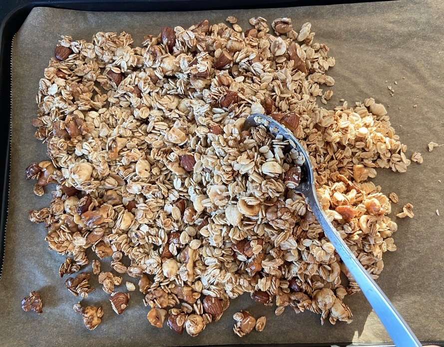 天板に広げてオーブンで15分焼き、外側から色付くので一度取り出して混ぜる。
