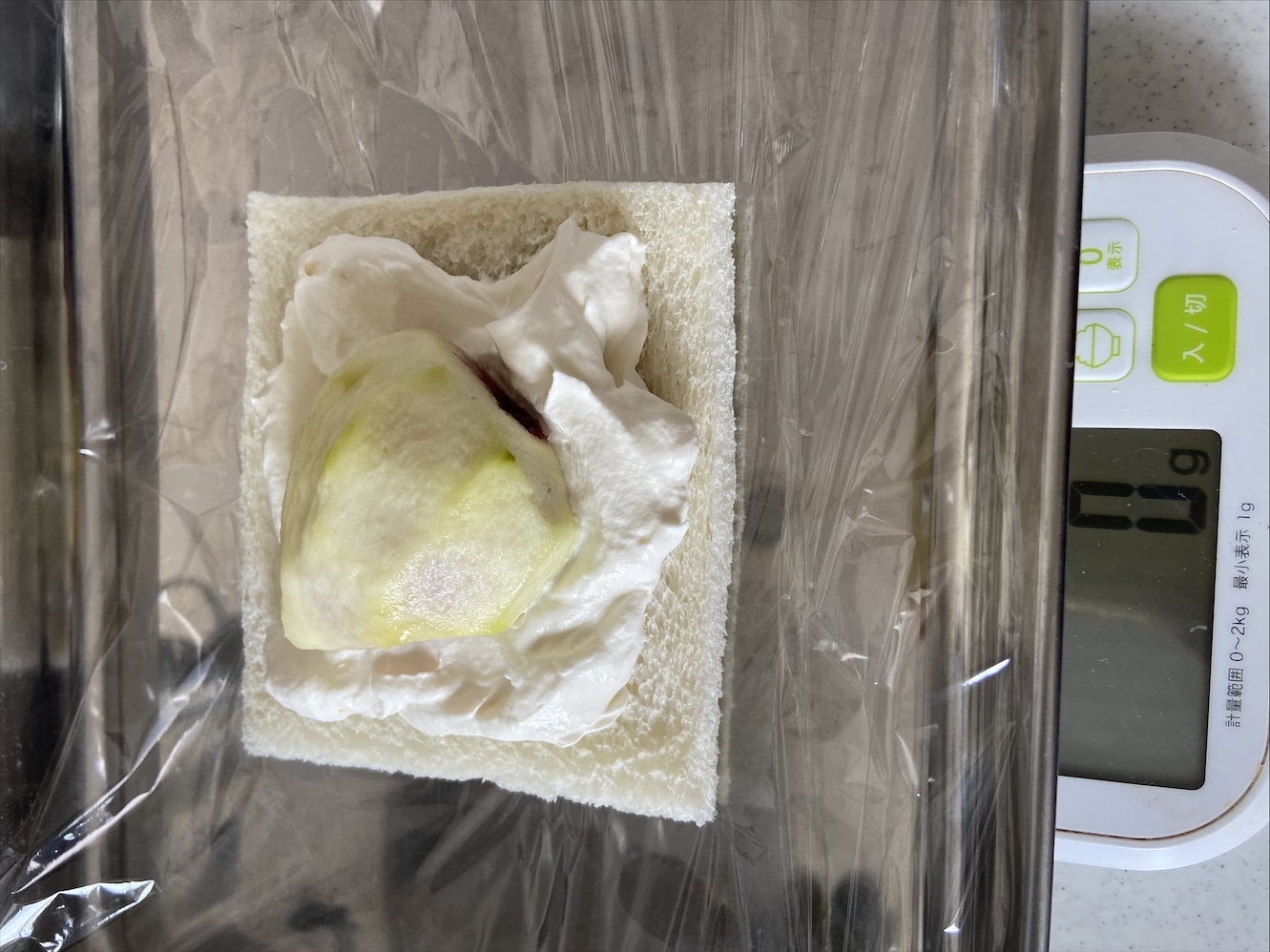量りの上に平らなバット、ラップ、パンをのせ25〜30gのクリーム、無花果をのせる。