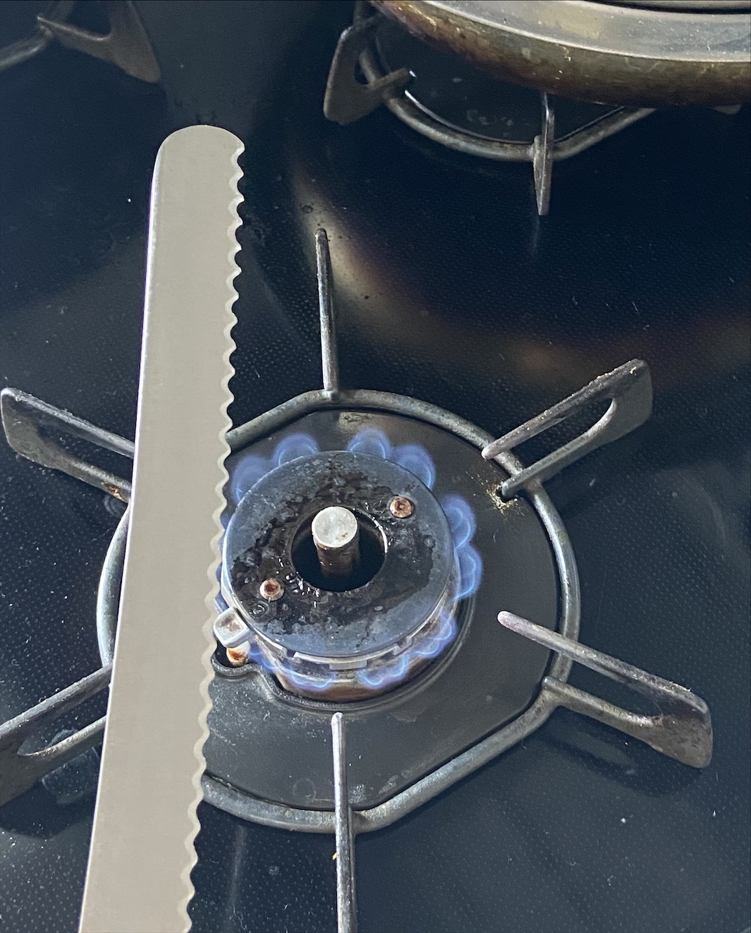 ナイフをコンロで軽く温めながら対角線上に切り、器に盛る。※ナイフは切る度にペーパー等で拭くときれいな断面に仕上がります