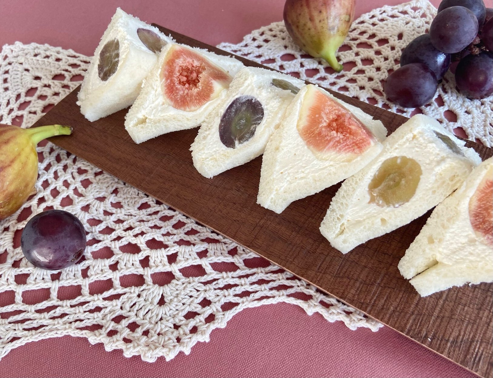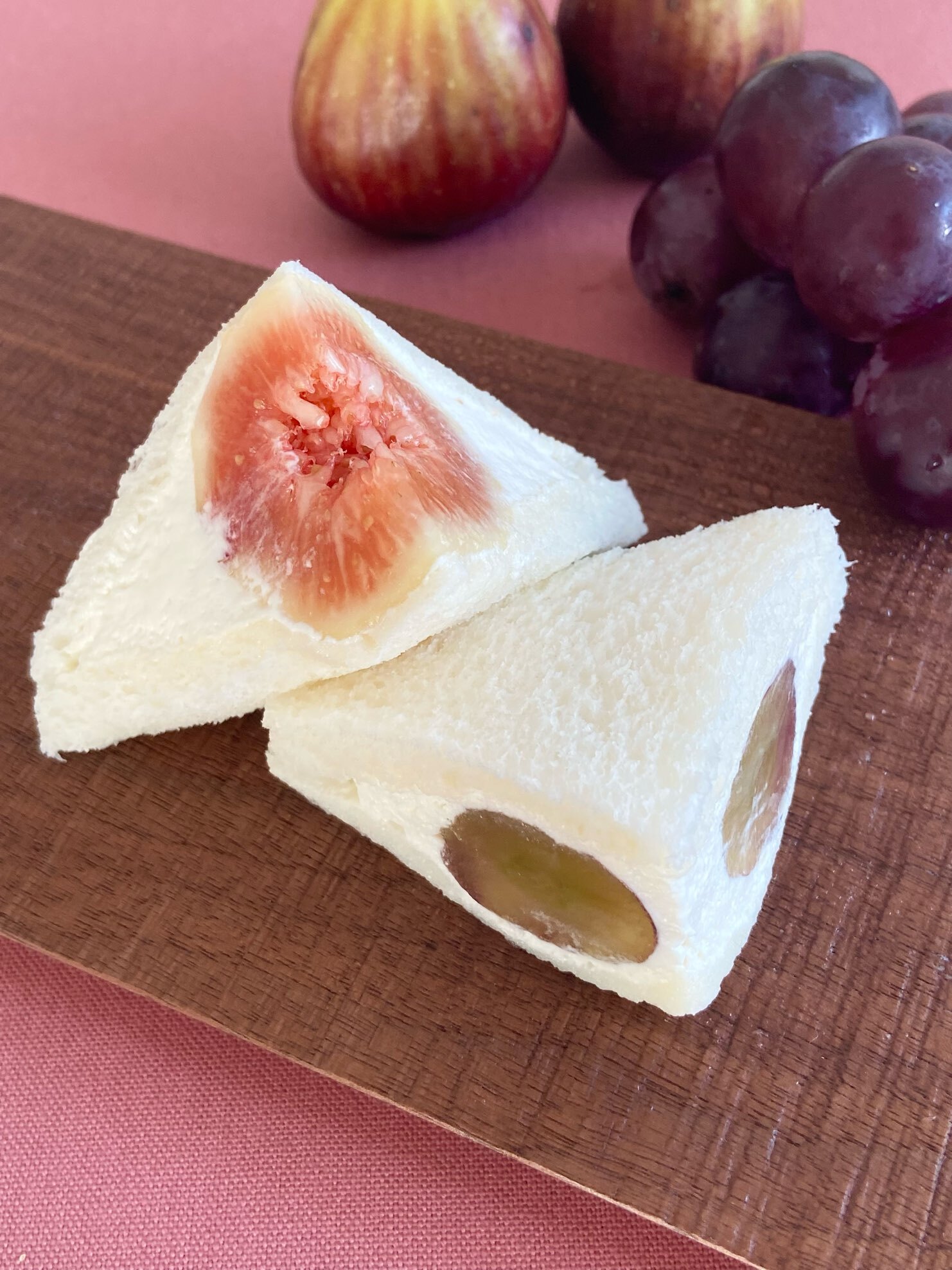 無花果と巨峰をフルーツサンドにしました。水切りヨーグルトのクリームはさっぱりとしてフルーツとベストマッチ!どちらも香り高いのでやさしい甘みのきび砂糖を使用しました。