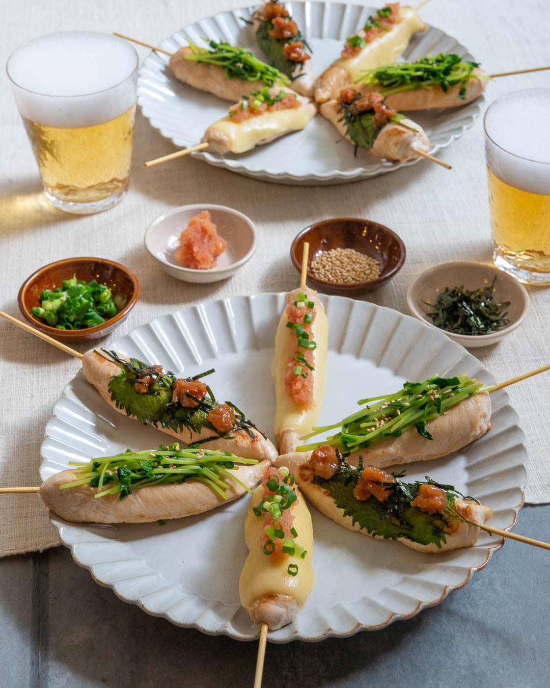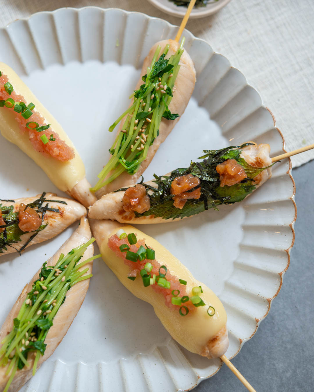 - 鶏ささみは、酒と塩で下味をつけ(5分〜)、竹串を刺す。