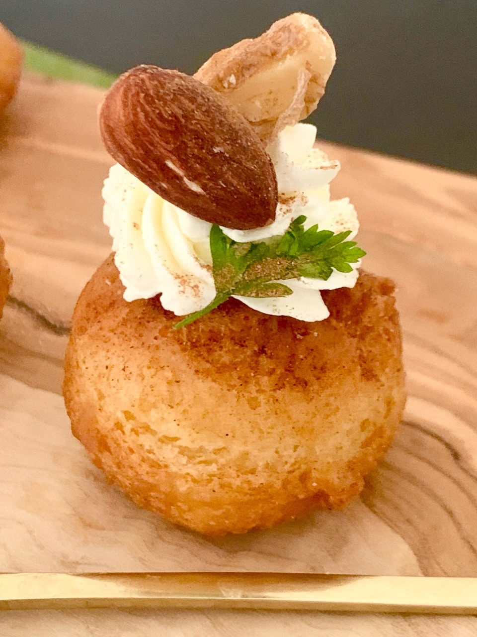 - ドーナツにクリームを絞り、ナッツをのせて器に盛り付ける。