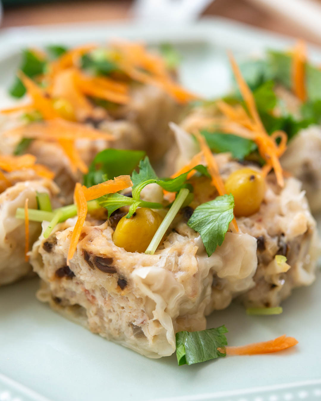 シュウマイのタネはしっかり混ぜることで味が均等になります。銀杏(水煮)はシュウマイのタネの中にしっかり押し込むことで、加熱後に浮いてくるのを抑えられます。