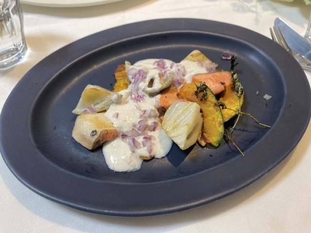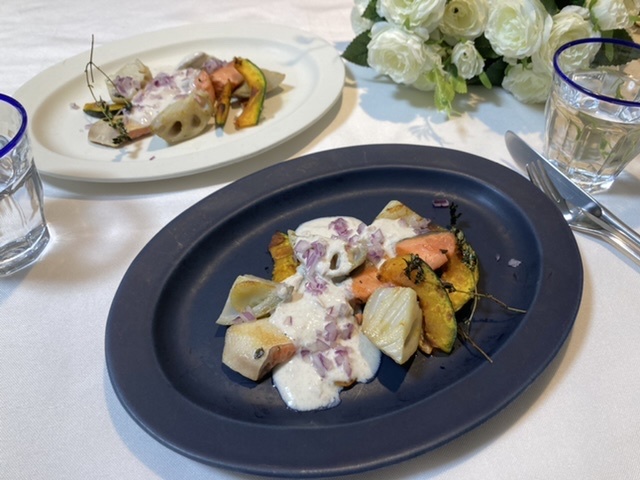 秋のお野菜(かぼちゃ、れんこん)と、サーモンをタイムとにんにくで香り付けしながら焼いた簡単お料理です。