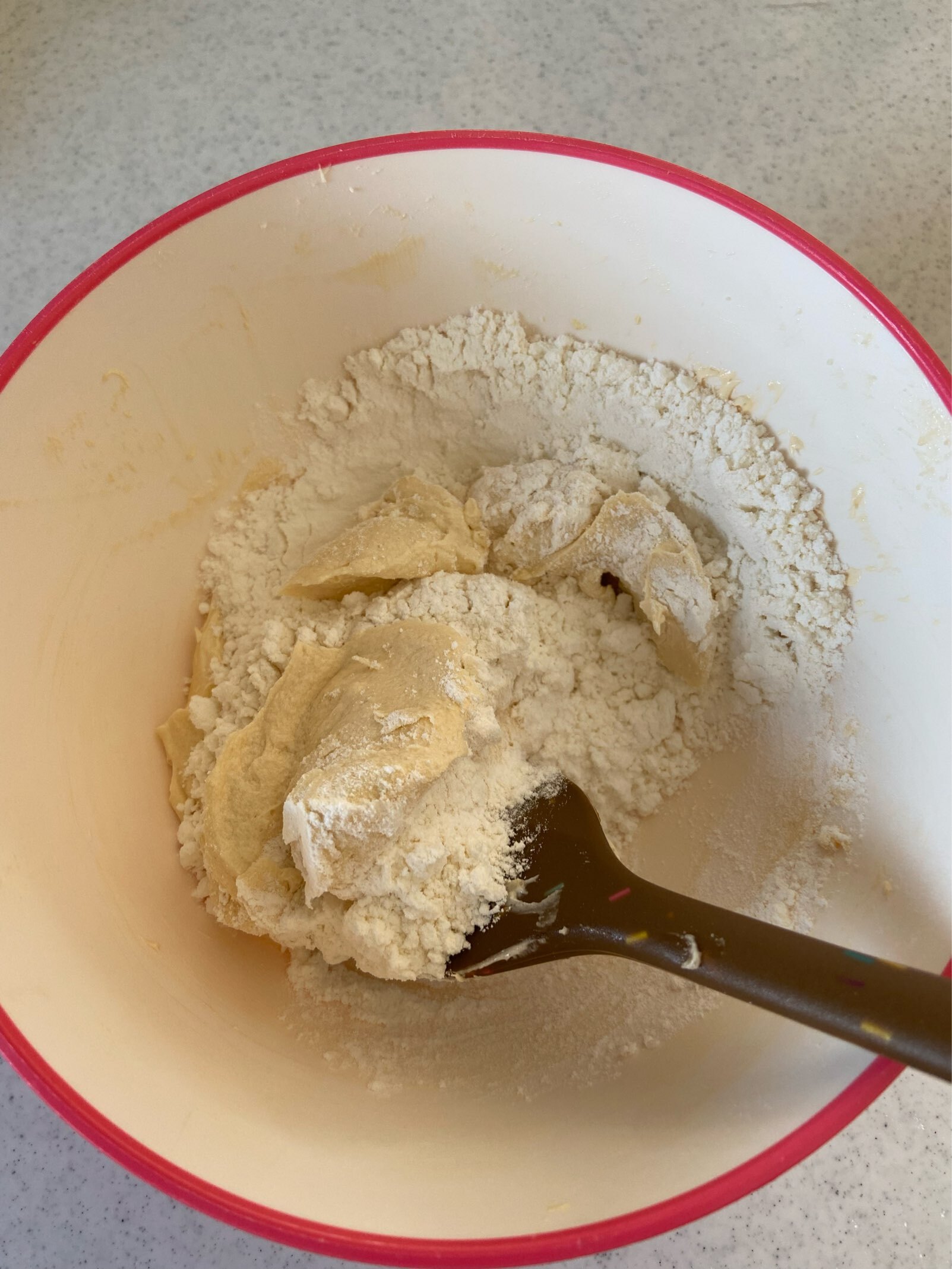 ホットケーキミックスの半量を入れゴムベラですくうように粉気が無くなるまで混ぜ、ヨーグルトを加え混ぜ、残りのホットケーキミックスを加えしっかりと混ぜる(グルテンが出にくいのでよく混ぜて良い)