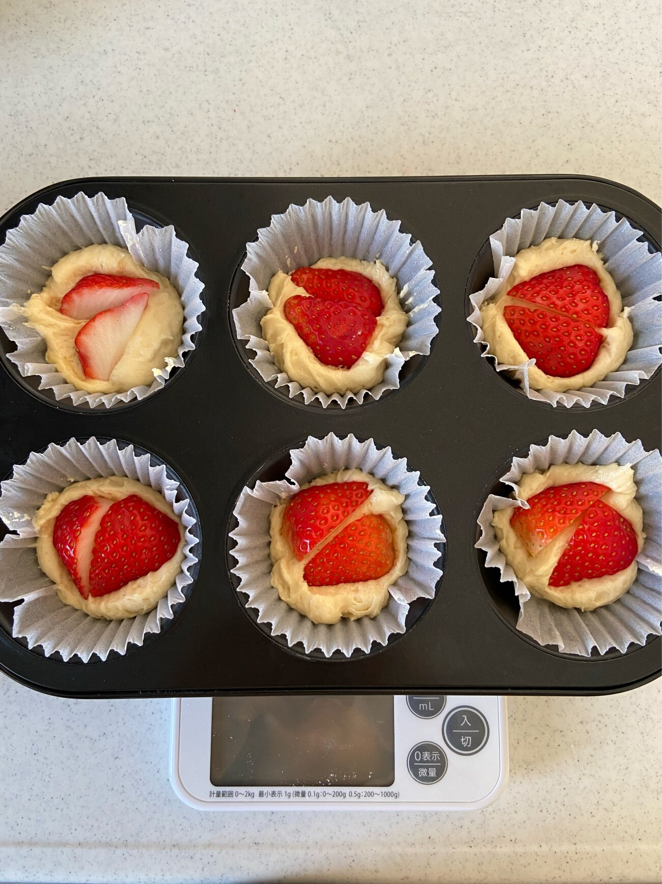 型に生地をスプーン1杯ずつ入れ、4等分にした苺を入れ軽く押し込む