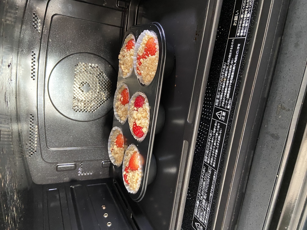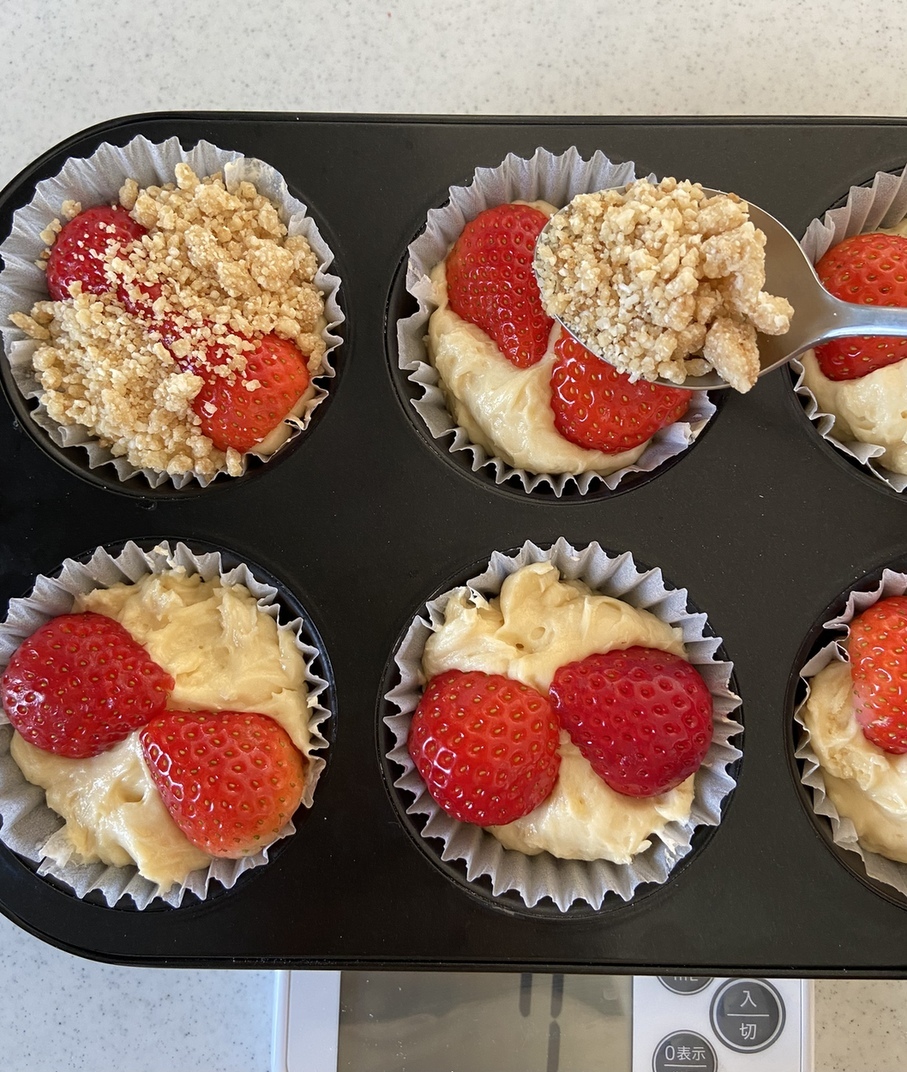さらに生地を入れ2等分した苺を押しのせ、クランブルをたっぷりとのせる