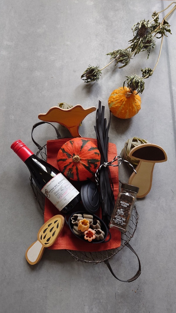 バック材をグレーにして器はアイアン パスタを紐で結んでクモのように メインのかぼちゃ(オレンジ)を置いて黄色のかぼちゃは少し外した位置に