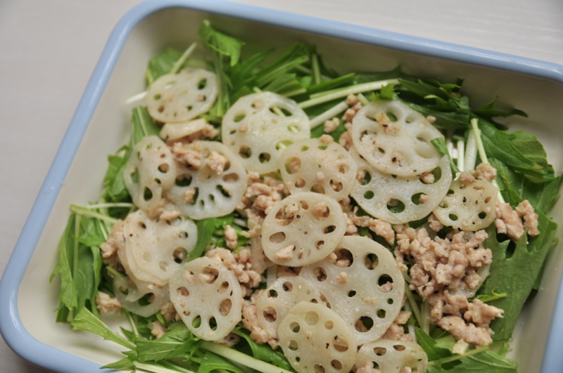 - 水菜を3cmの長さに切り、3とともに皿に盛る。