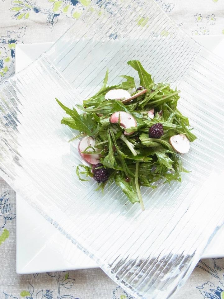 グリーンサラダです。ドレッシングはブラックベリー。純米酢にフルーツジャムを合わせて、フルーツビネガーの出来上がり。さっぱりとシャキシャキした水菜の食感に合います。この他、ブルーベリーやラズベリーなどのジャムでも美味しくいただけます。