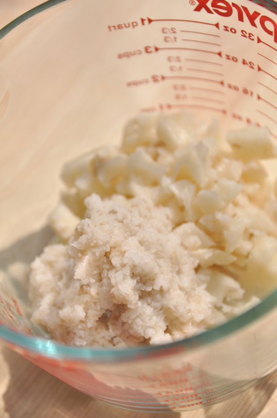 れんこんは皮をむき、細い部分を4枚の薄い輪切りにする。残りのれんこんの半分は荒くつぶし、もう半分のれんこんとショウガをすりおろし、生しいたけは粗みじん切りにする。