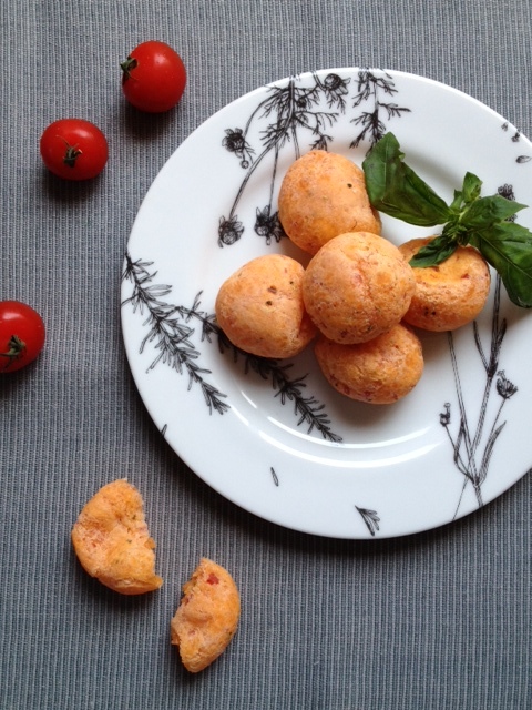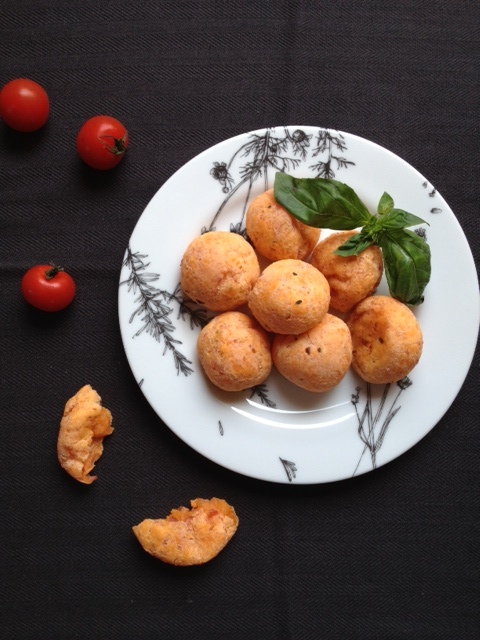 ポンデケージョ。ブラジルで生み出されポルトガル語で「チーズのパン」というそうです。トマトテイストに仕上げました。約18個ぐらい出来ます。トマトジュースの分量を水または牛乳に変えるとノーマルタイプに仕上がります。加えてドライバジルと松の実をペースト状にしたところもオリジナリティです。イタリアンチックになりました。スタイリングでは、バック材だけを変えてみました。ブラックとライトグレーでは印象が違います。クロス選びもシチュエーションがポイントです。