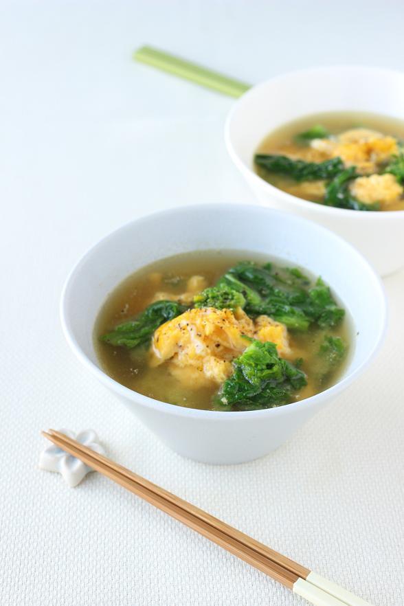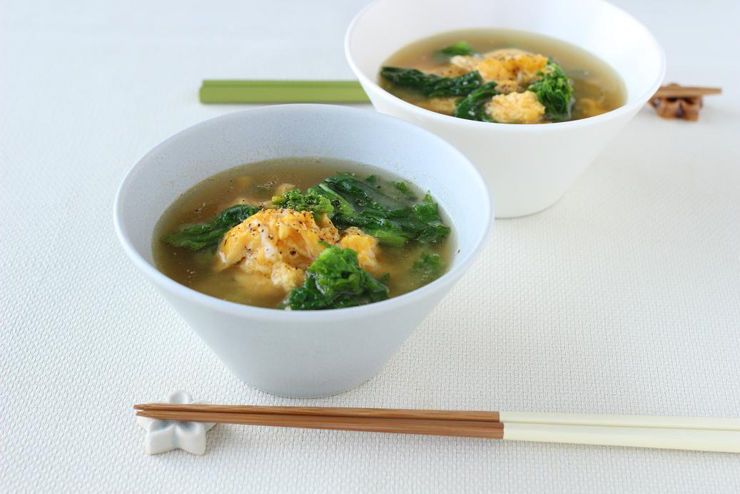 春野菜「菜の花」のお味噌汁。卵をスクランブルエッグにして加えるので味噌汁にコクが加わり、ふわふわ感と卵の風味が、ほろ苦い菜の花とよく合います。ブラックペッパーがアクセントの春のお味噌汁です。