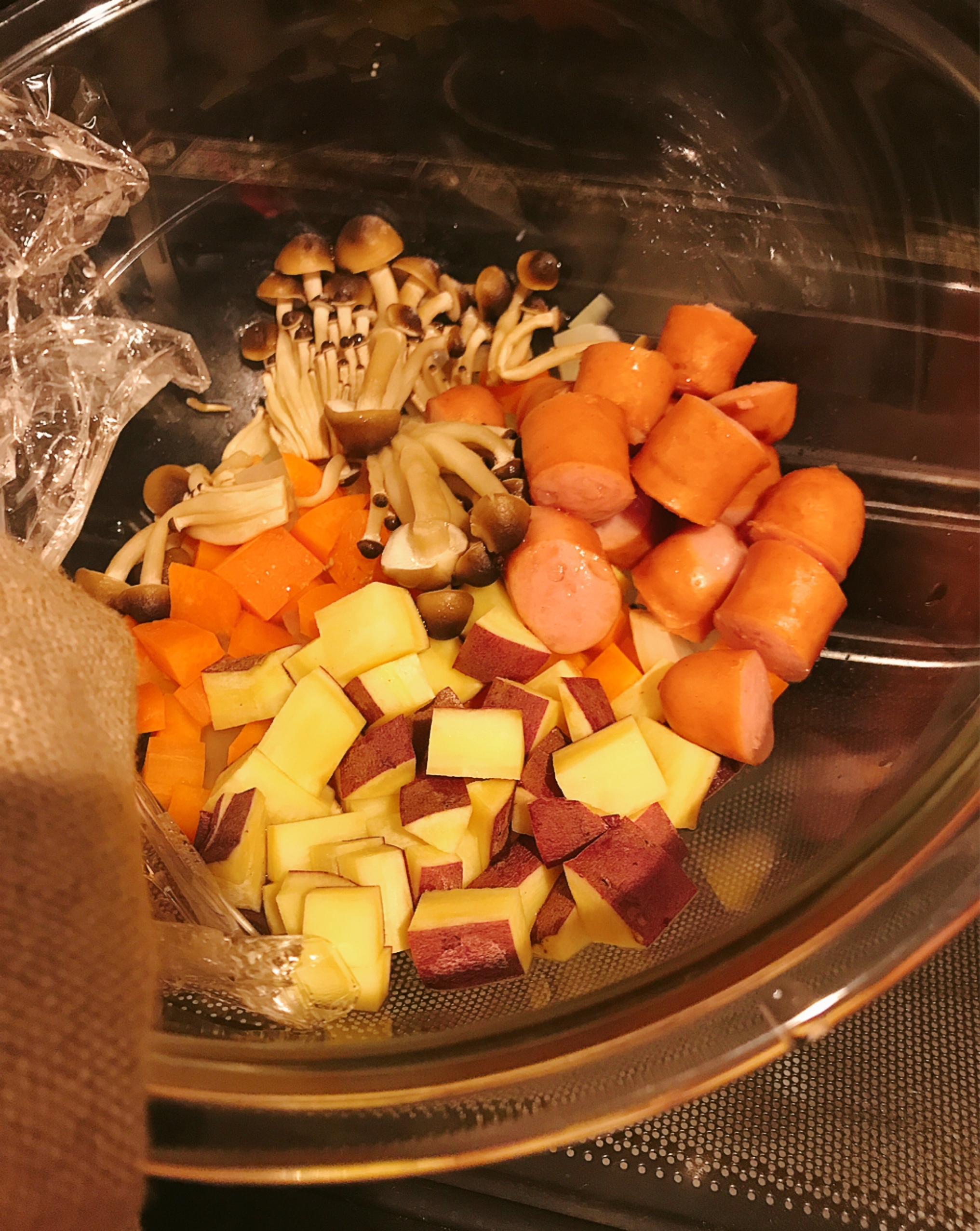 【材料を電子レンジで加熱する】①を耐熱ボウルに入れ、ふんわりラップをかけ、電子レンジ(600w)で3分加熱する。(※電子レンジを使用しない場合は、小鍋に材料がかぶるくらいのお水を入れ火にかけ、柔らかくなるまで煮込む。)