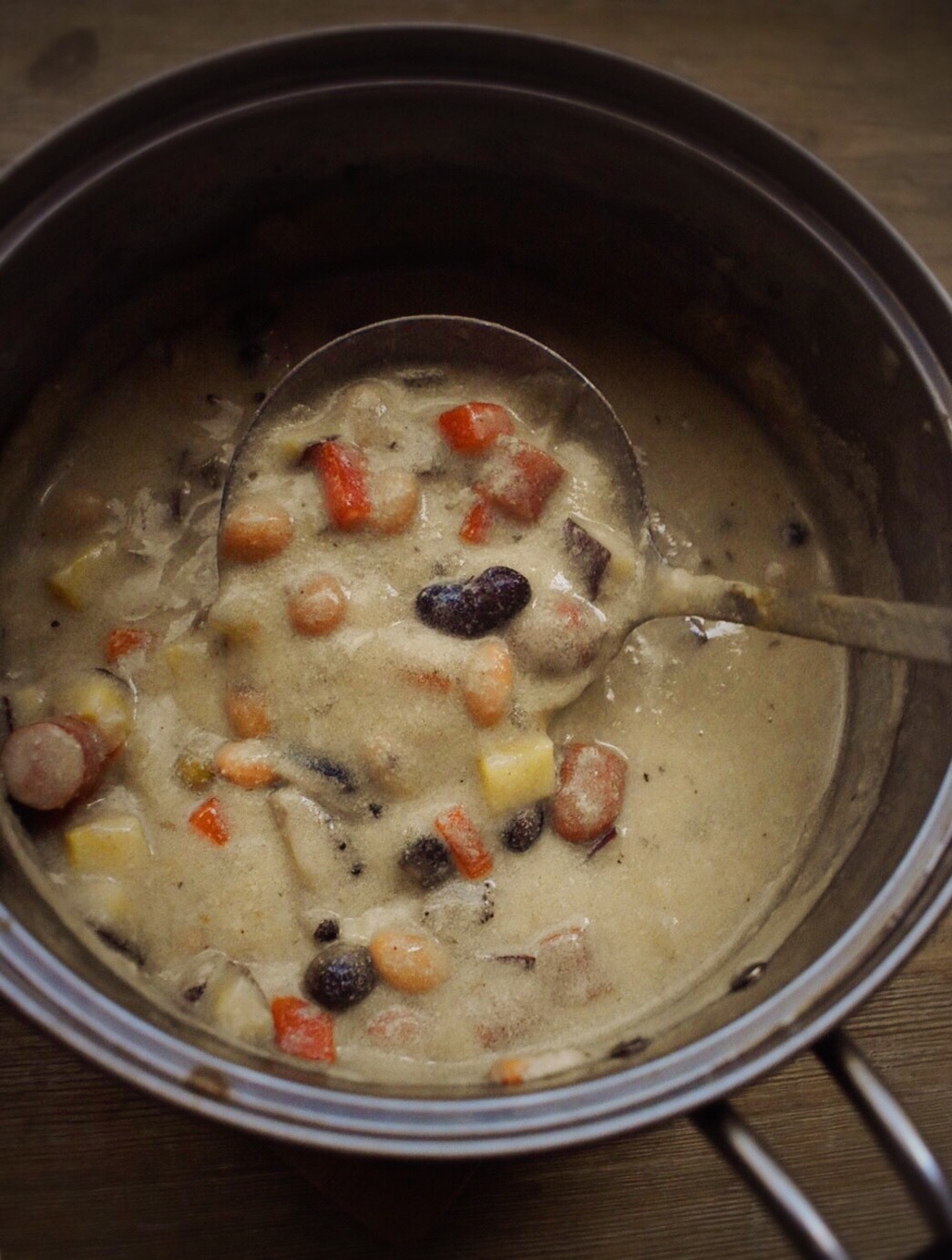 - 【煮込んで味噌を溶く】小鍋に②と[A]、ミックスビーンズを加え、火にかける。一煮立ちしたら一旦火を止めて、味噌を溶き入れる。塩コショウをして味を調える。