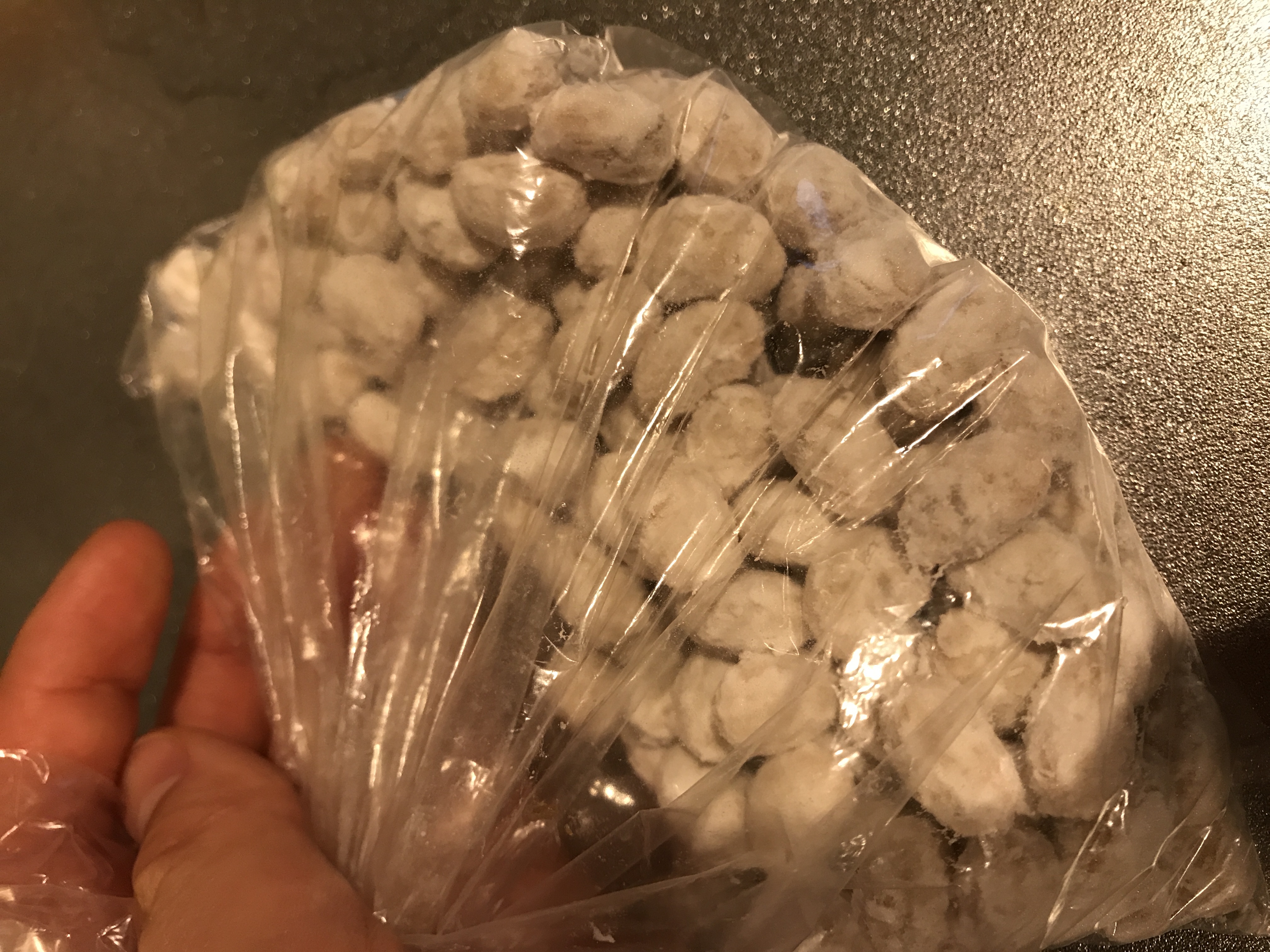 大豆と片栗粉をビニール袋に入れる。空気を入れるように口をねじり、両手を使い上下に振る。