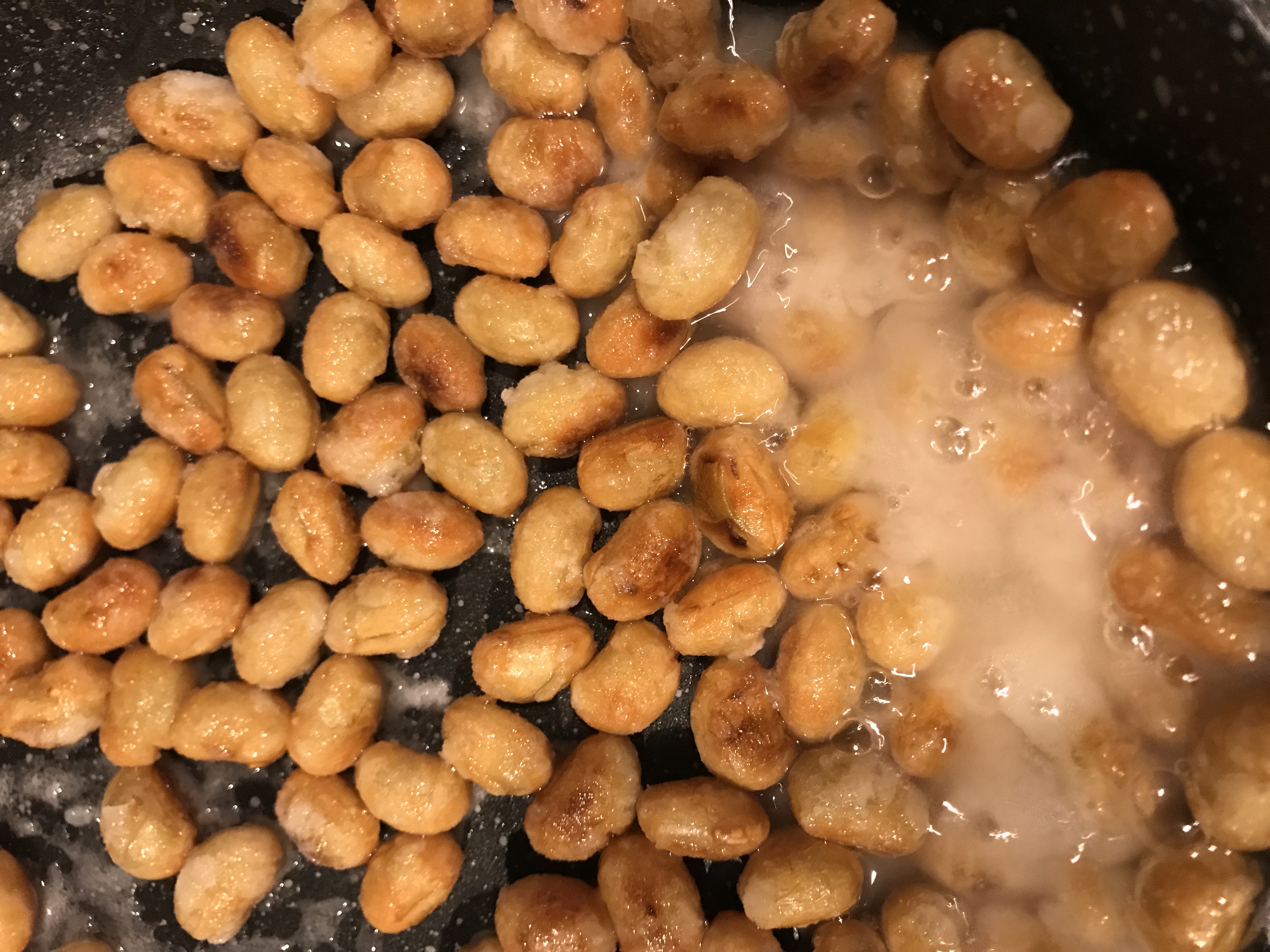 フライパンに多めの油(分量外)を引き、中火〜強火で熱する。②を加え、大豆の表面が白っぽくなるまで時々フライパンを揺すりながら揚げ焼きにする。(約5分程)