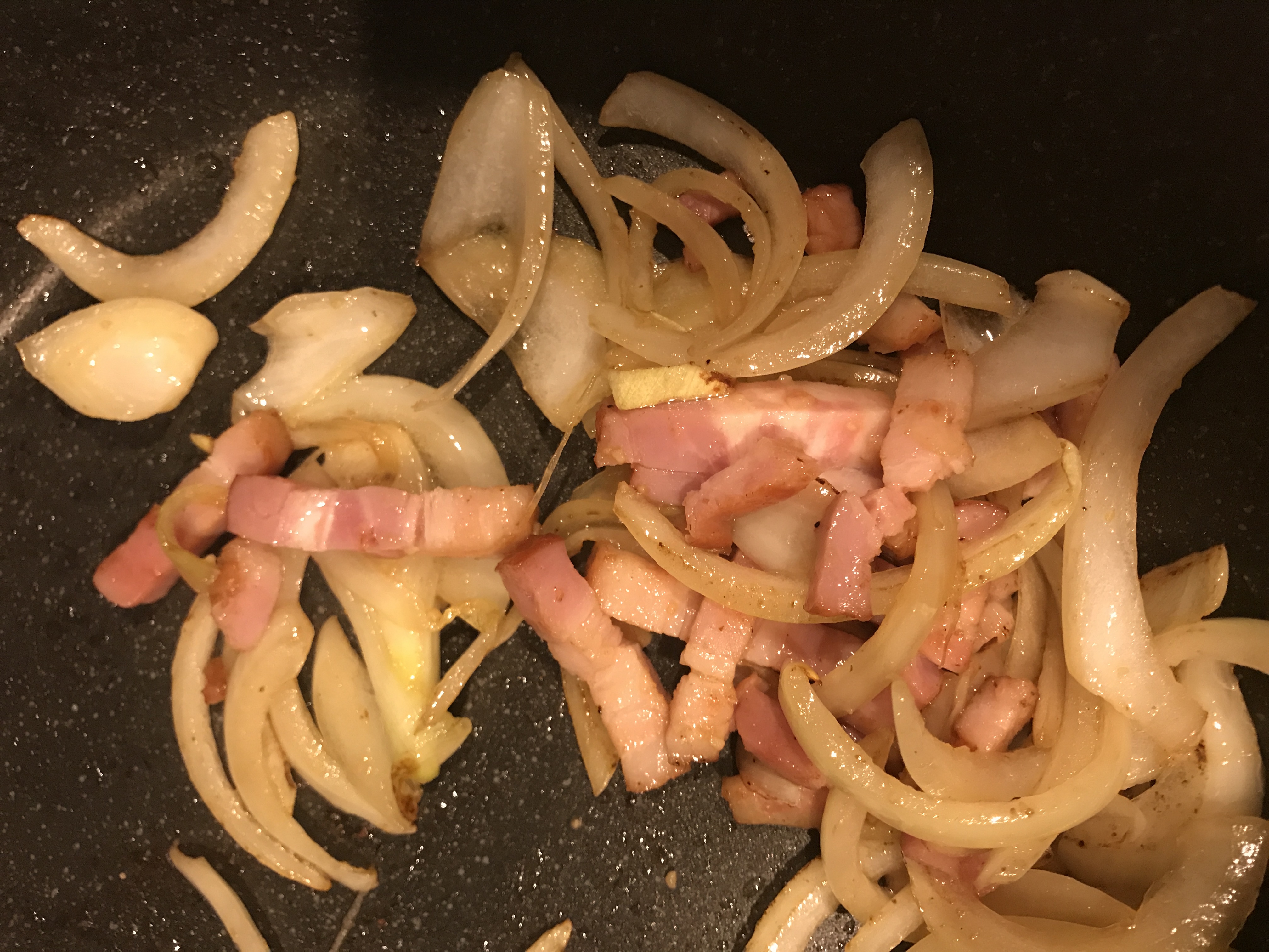 フライパンにオリーブオイルをひき、①とニンニクを入れ、中火にかける。玉ねぎがしんなりし、ベーコンに焼き色がついたら[A]を加える。