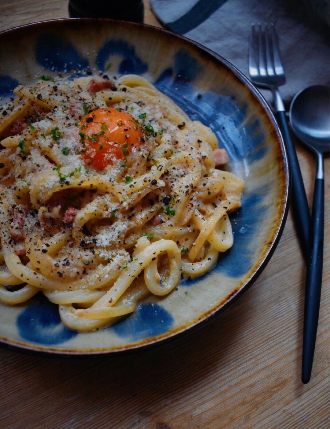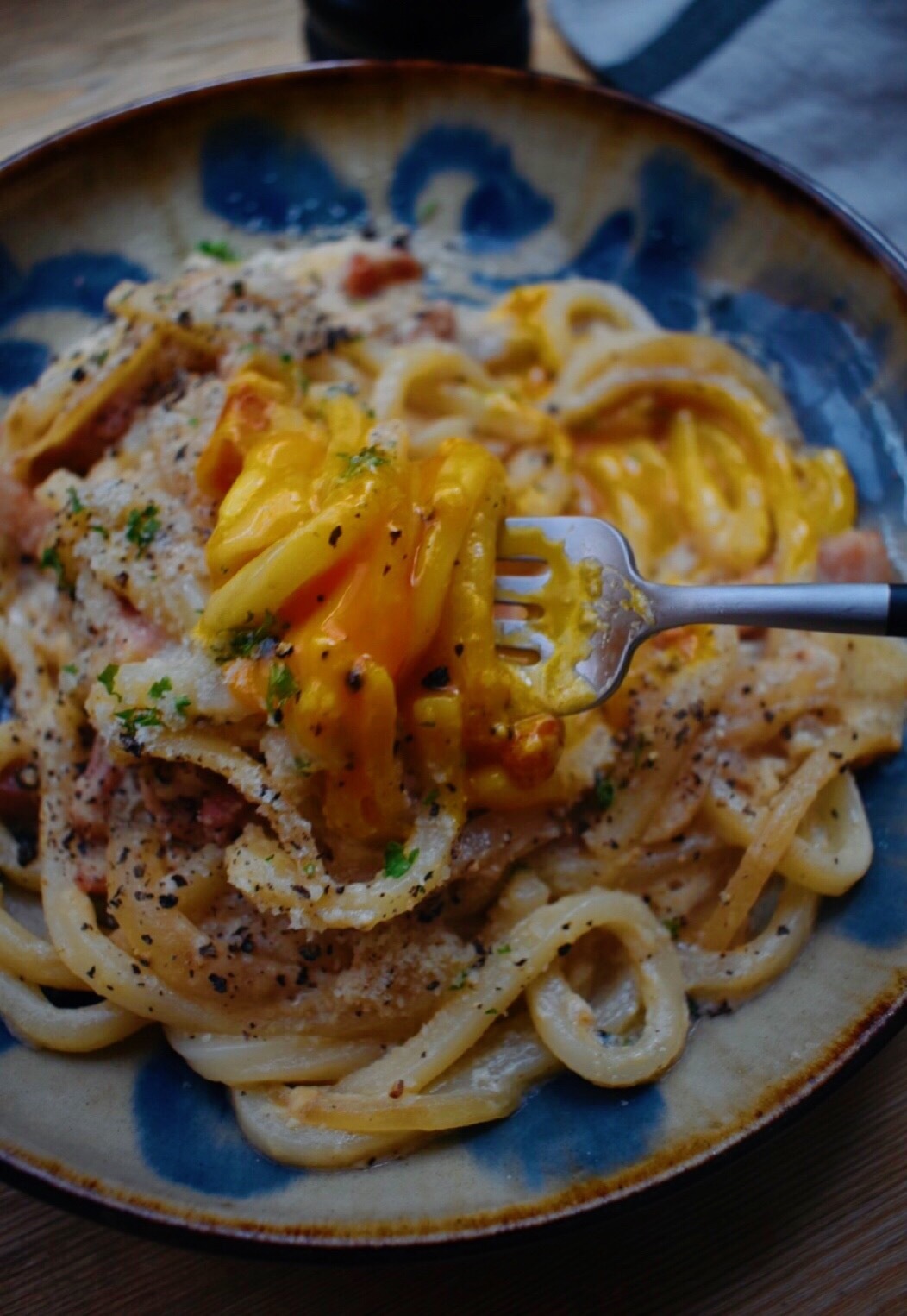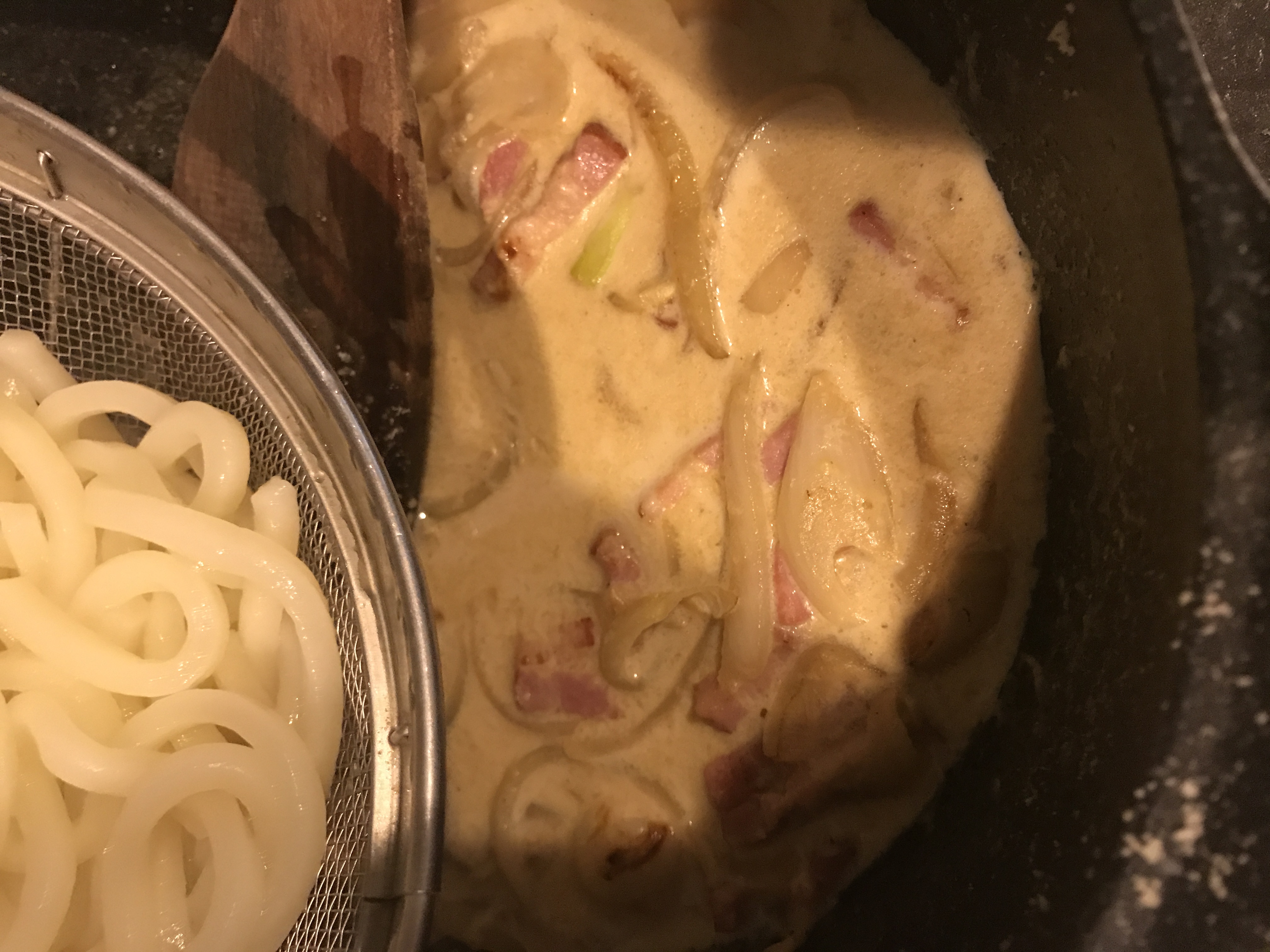 このレシピは家に冷凍うどんが大量にストックしてあった時に思いついたものです…(笑)地元のお店で働いていた頃によく作らせて頂いていたカルボナーラを参考にご家庭でも作りやすいようにアレンジしました。今回はベースは生クリーム等を使用せず豆乳で作ります。とっても簡単なのにお店の味!!とろ〜り卵と絡ませて食べると絶品ですよ〜〜!*ˆˆ*✨
