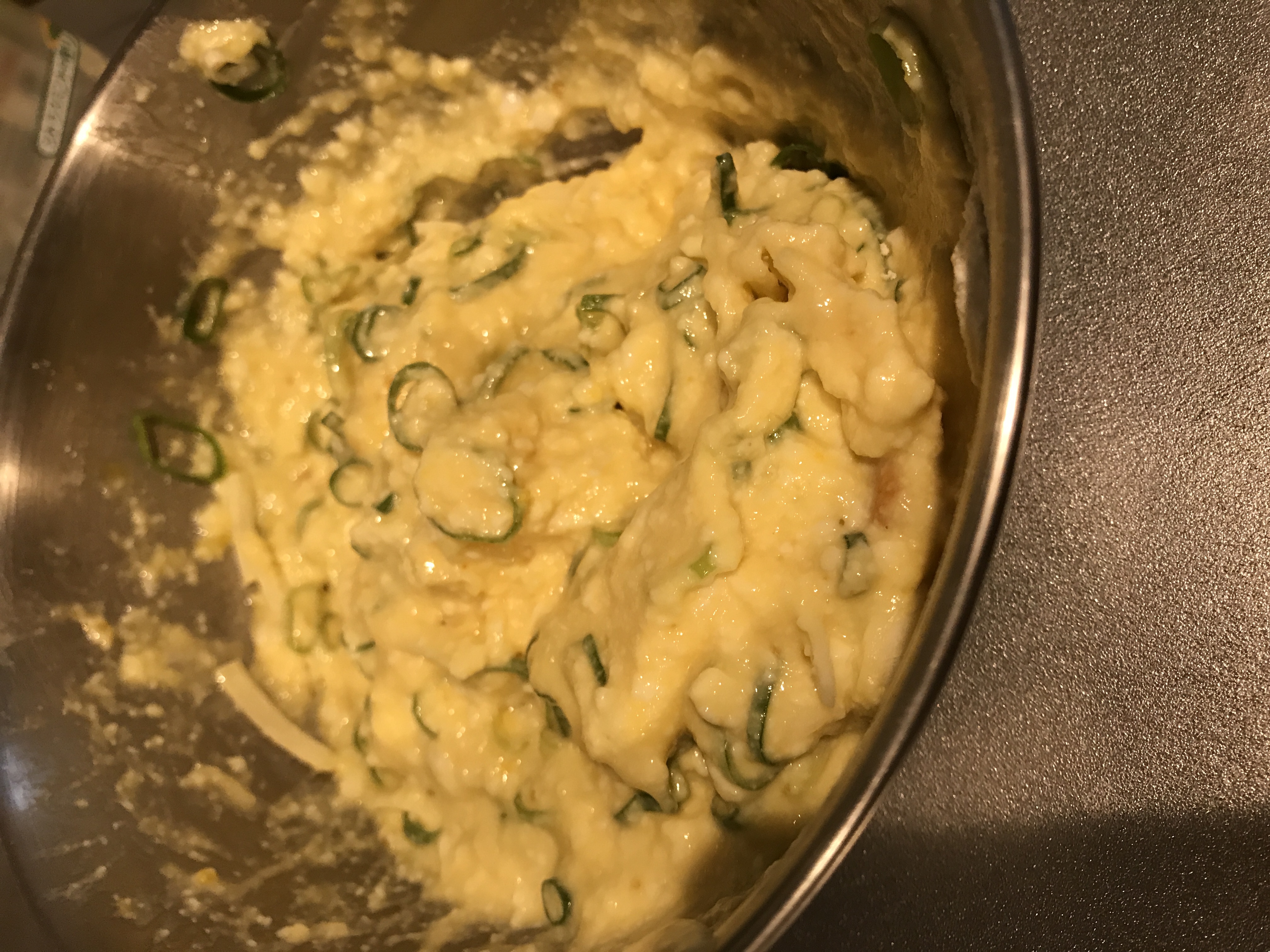 ボウルに豆腐と[A]を入れて、よく混ぜる。生地が滑らかになったら刻みネギとピザ用チーズを加え、さっくり混ぜる。