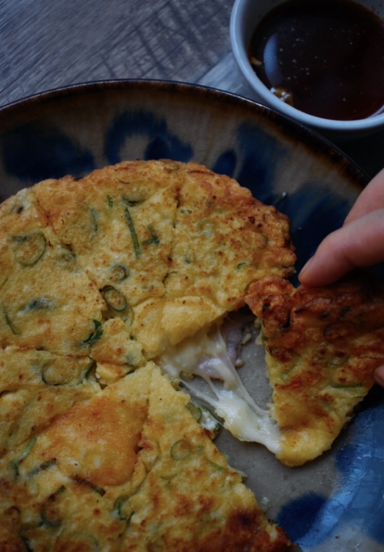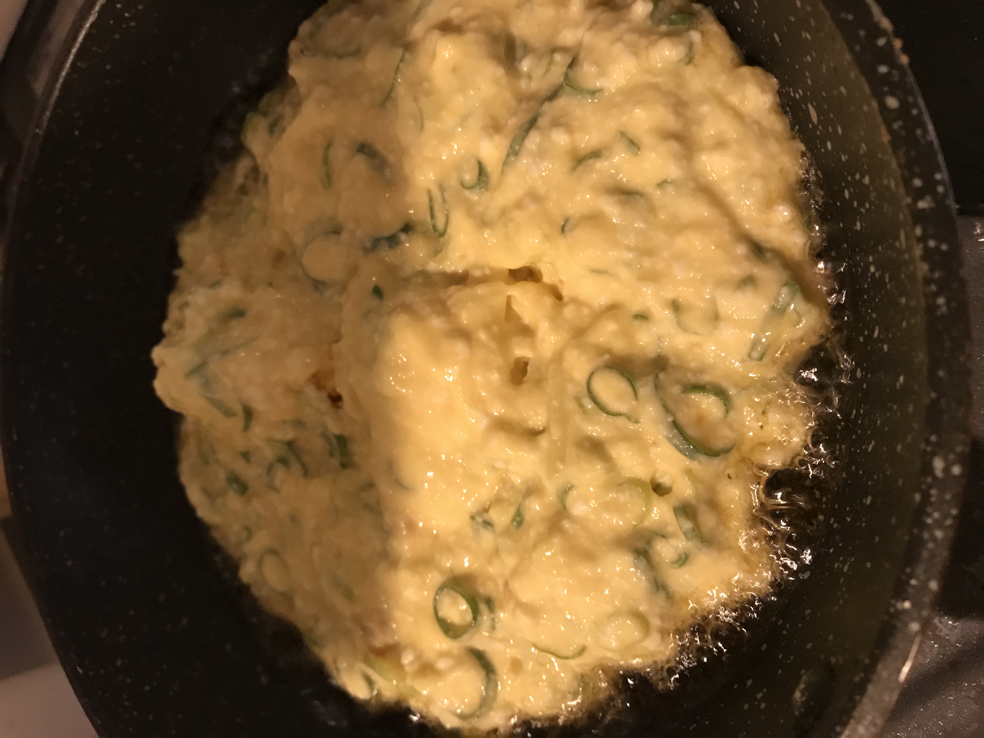 フライパンに胡麻油をひく。上から①を流し入れ、強火で蓋をして(orアルミホイルをかぶせ)じっくり焼いていく。