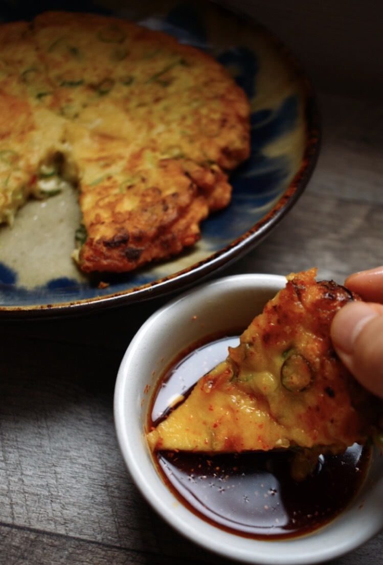 - 両面に焼き色がつき、中まで火が通ったら皿に移す。お好みで一味唐辛子をかけ、ポン酢をつけて食べる。