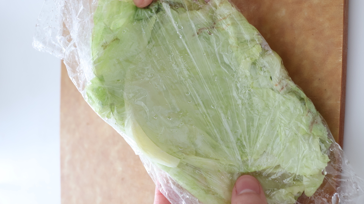 キャベツはよく洗い、芯は切り、ラップをしてレンチン3分する。