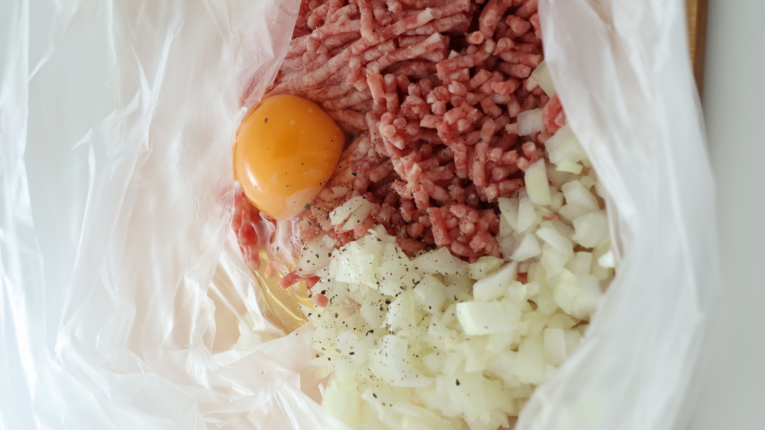 ◎の材料と玉ねぎをポリ袋に入れて混ぜる。