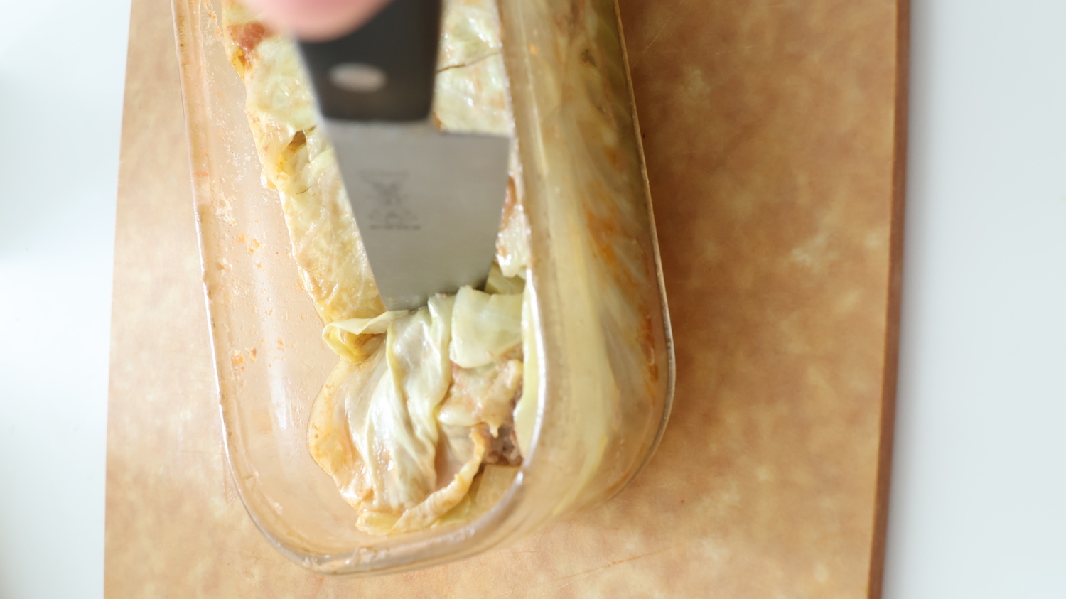 トマトソースを混ぜ合わせ、流し入れ、キャベツでふたをする。
