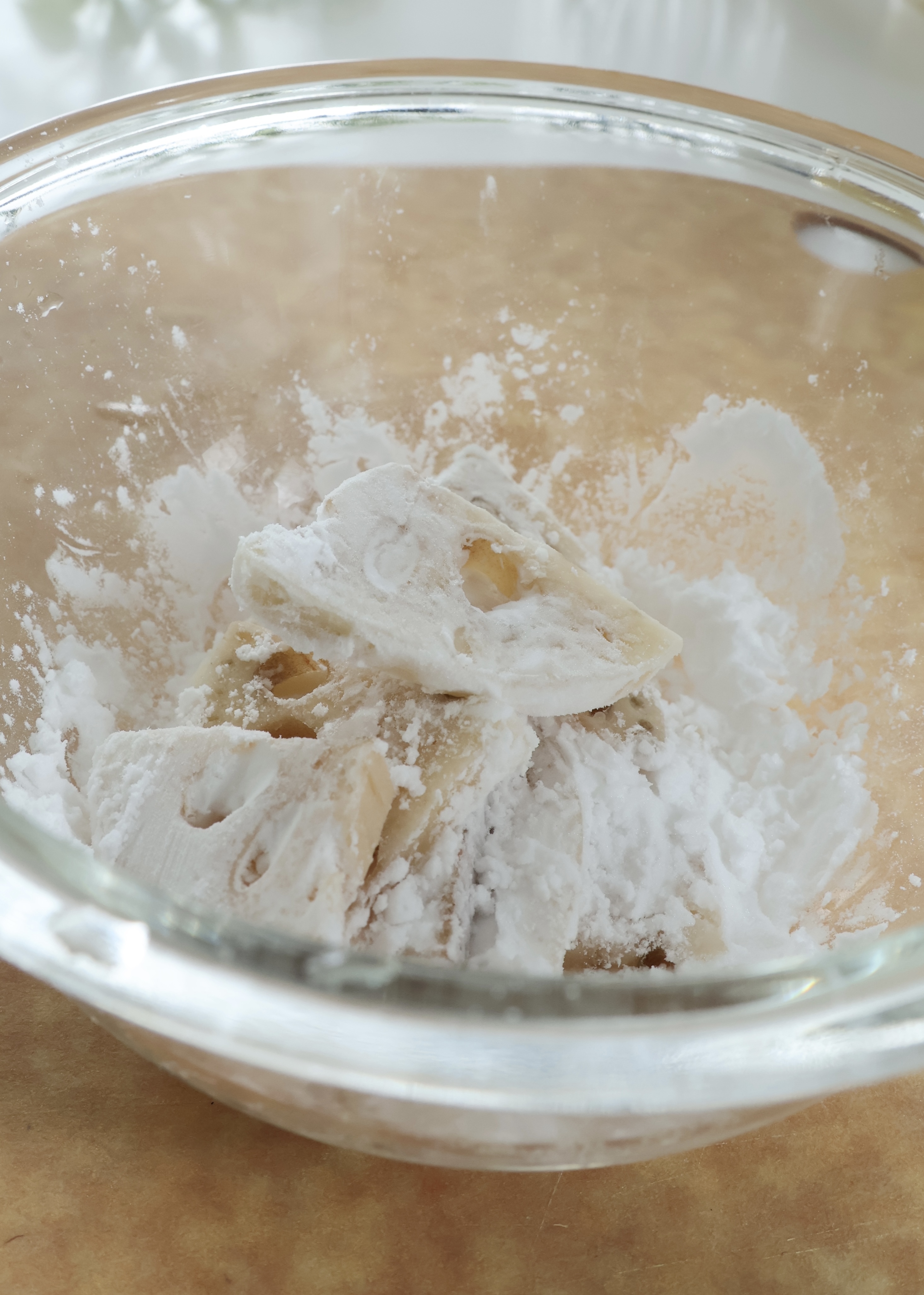②の水気をよく拭き取り容器に入れて片栗粉をまぶす。