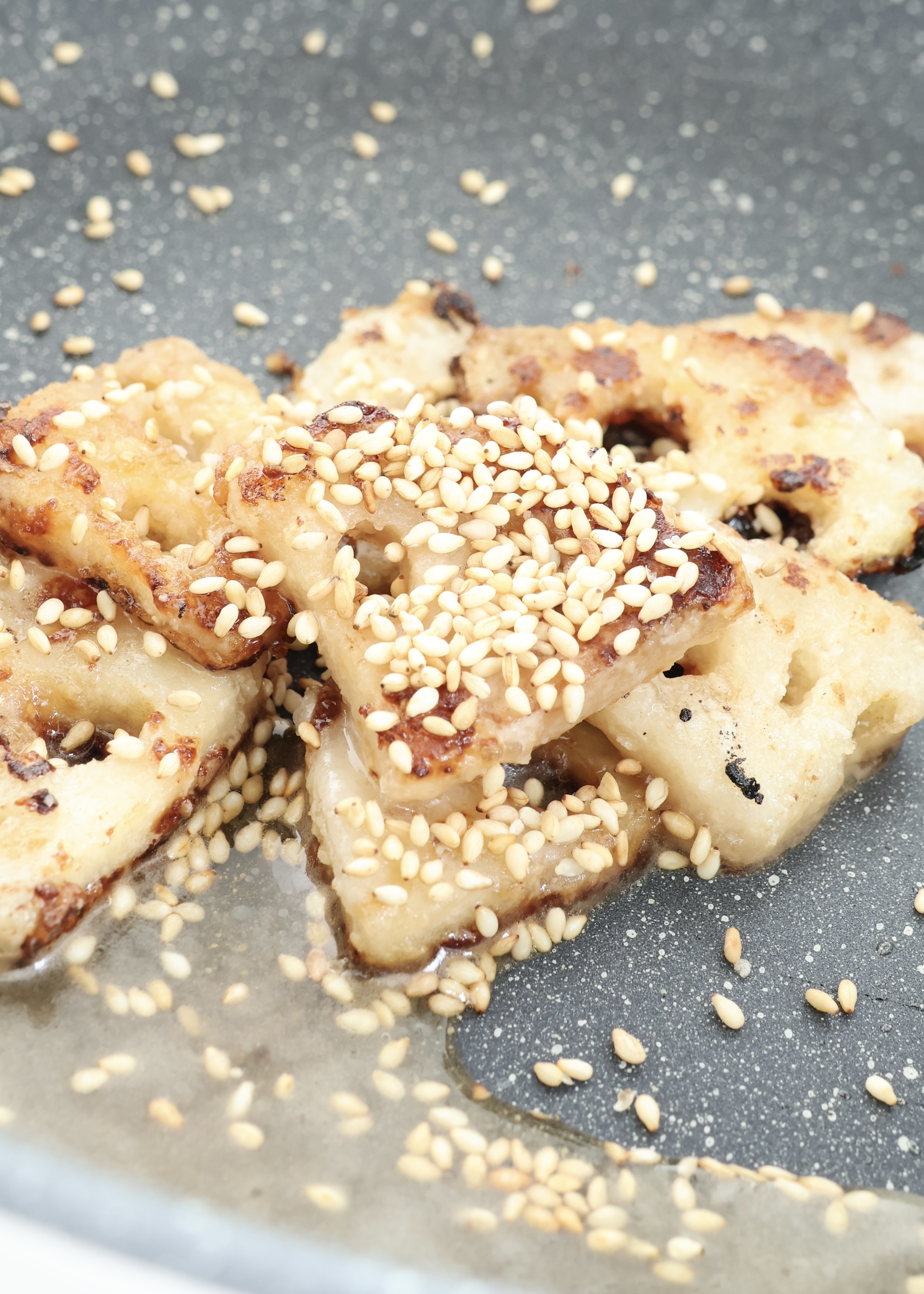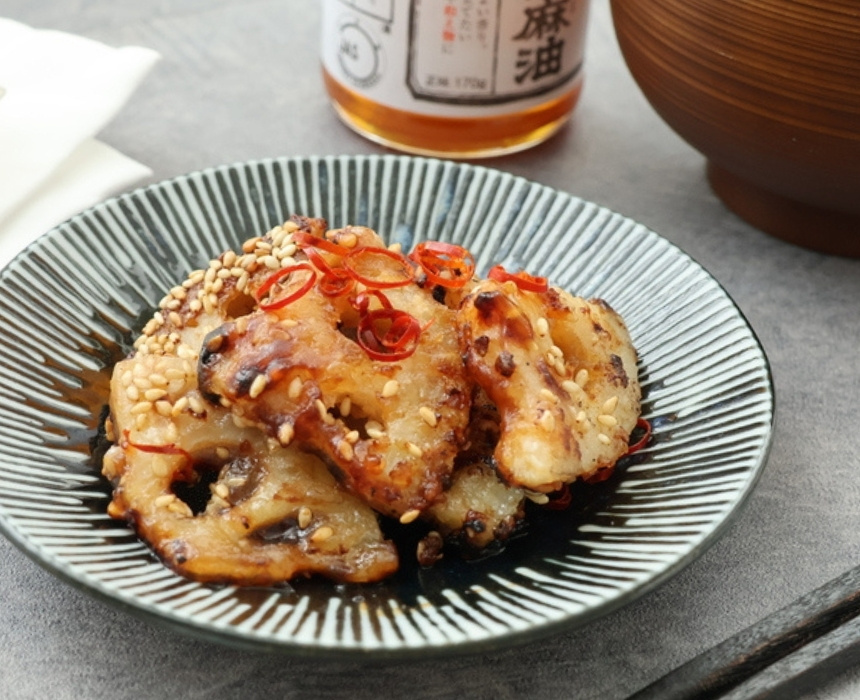 れんこんのシャキシャキ感が堪らないれんこんのきんぴら。ついついごはんが進んでしまう味付けになっています。