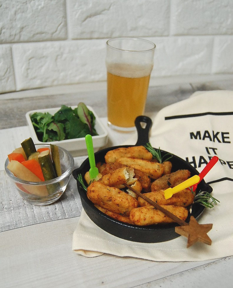 もっちりとした白玉粉の食感が楽しめる、一口サイズのフライドポテトです。スナック菓子のように気軽にパクパク食べられます。